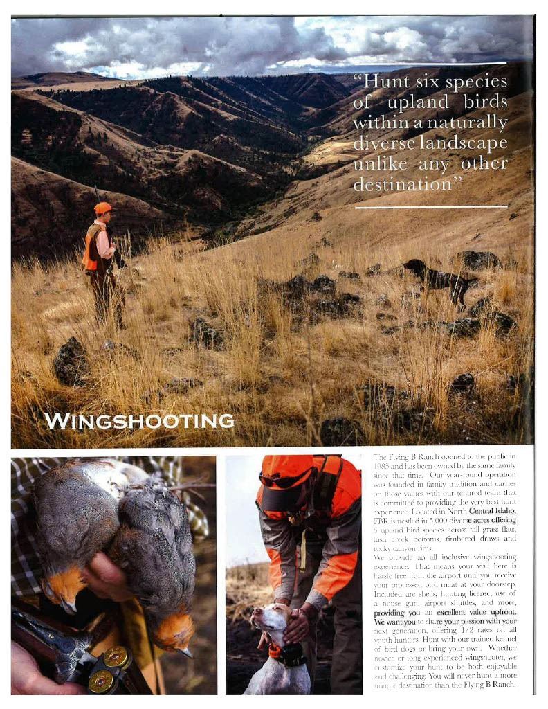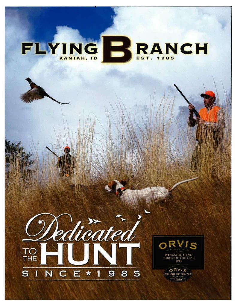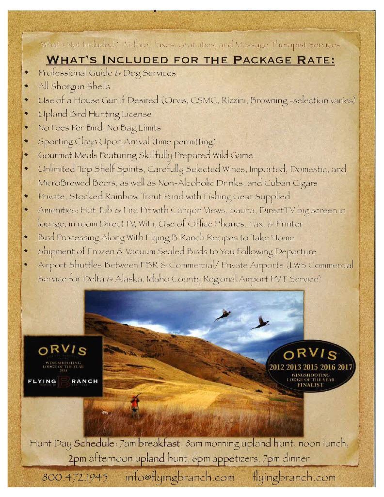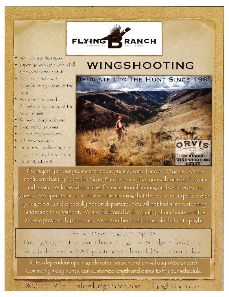 Two hunters will enjoy this 2-day 3 night wing shooting adventure in Idaho donated by Flying B Ranch. This trip offers hunting up to five species of upland game birds. Schedule this trip with outfitter for open dates in the spring or fall of 2022 only. No alternate dates are available. Included in this package are professional guide & dogs, luxury lodging, chef prepared meals, and beverages, including spirits, wine and beer all licenses, bird processing & shipment, shotgun shells and airport shuttle. Additional hunters may join for $4,650; observers $900. Not included any before/after trip expenses, Idaho 6% sales tax, lodging tax and gratuities. Arrival/departure point is Lewiston, Idaho.