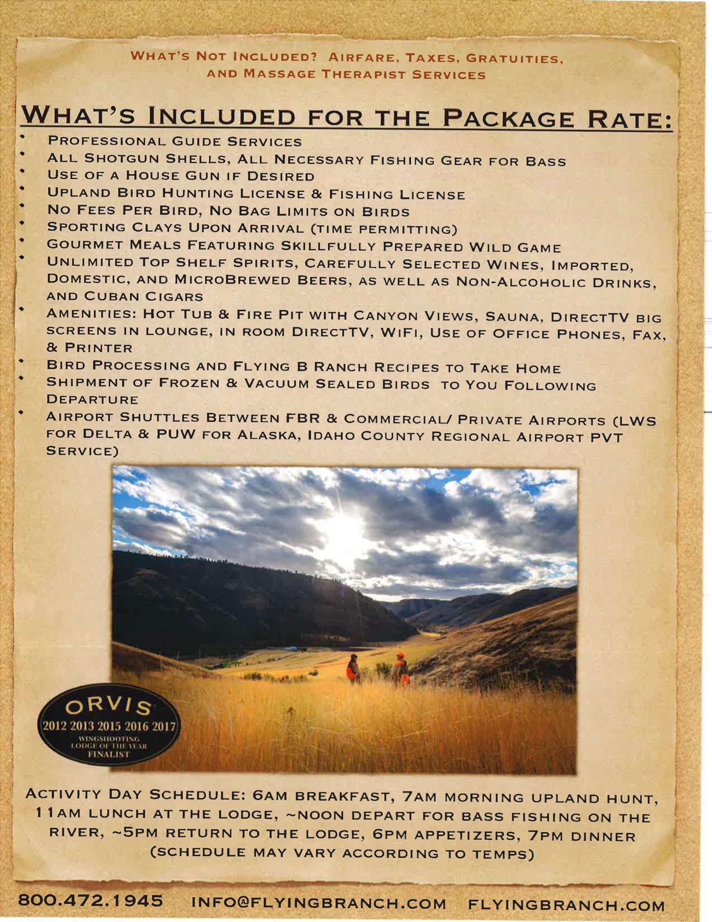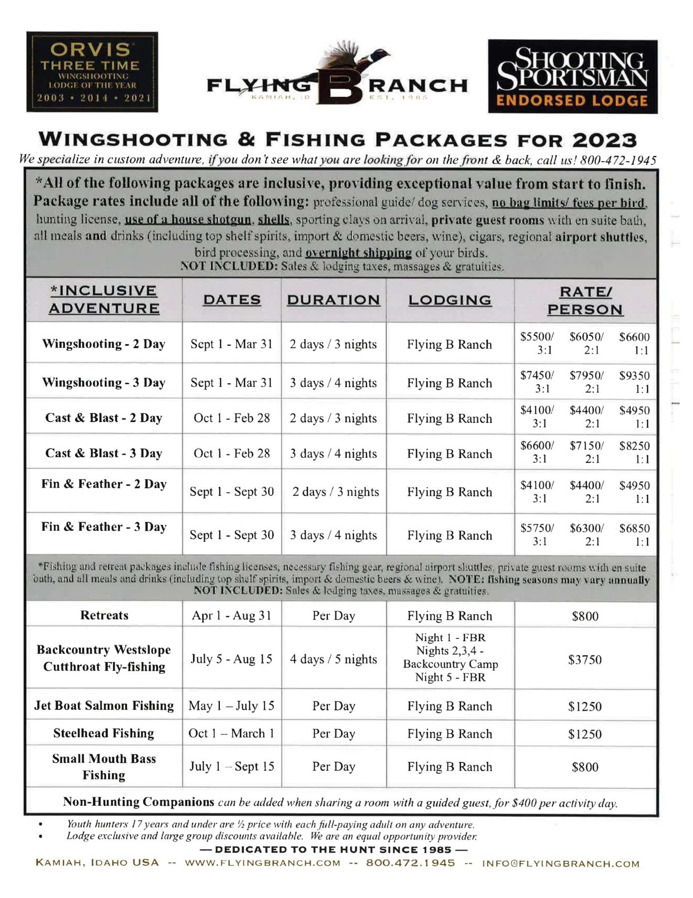 Two hunters will enjoy this 2-day 3 night wing shooting adventure in Idaho donated by Flying B Ranch. This trip offers hunting up to five species of upland game birds. Schedule this trip with outfitter for open dates in September 2023 only. No alternate dates are available. Included in this package are professional guide & dogs, luxury lodging, chef prepared meals, and beverages, including spirits, wine and beer all licenses, bird processing & shipment, shotgun shells and airport shuttle. Additional hunters may join per price list; observers welcome per price list. Not included any before/after trip expenses, Idaho 6% sales tax, lodging tax and gratuities.