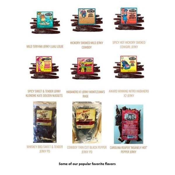 Jerky Jerks Dba Jerky Hut has donated $300.00 Worth of Pre-packaged Jerky. The box features a variety of award winning gourmet top sirloin jerky in