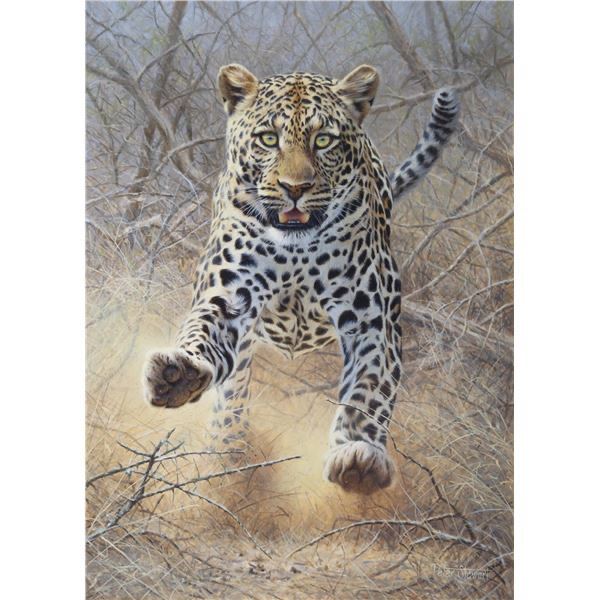 The 2025 Artist of the year, Peter Stewart, has generously given us one of his 2024 prints titled, "Adrenaline Shot". It features a leopard rocketing from its resting place. Peter creates these images with amazing detail. This print is unframed and ready to ship. Thank you Peter for your generous 100% donation.
