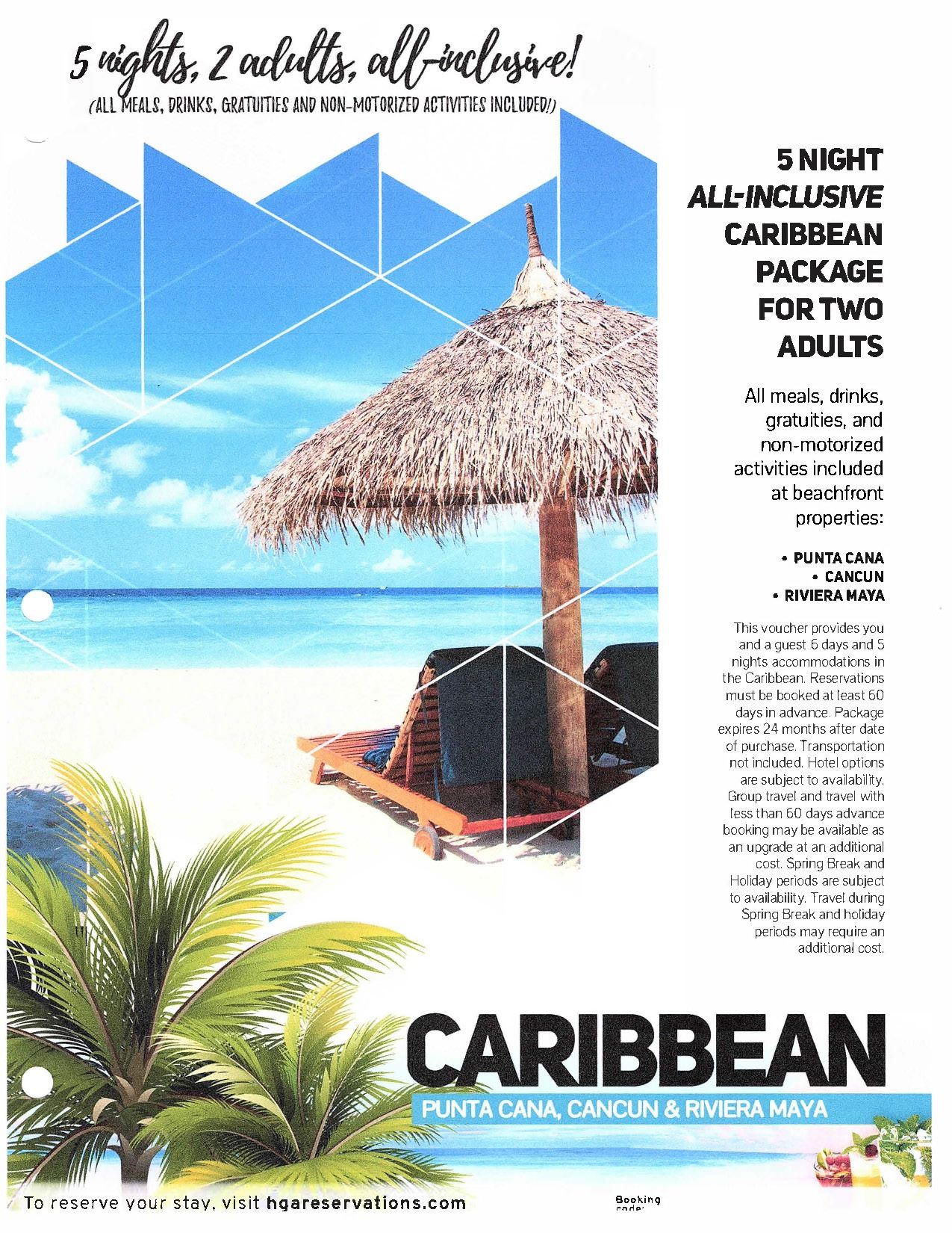 Provides you and a guest 6 days and 5 nights accommodations in the Caribbean. Reservations must be booked at least 60 days in advance. Package expires 24 months after date of purchase. Transportation not included. Hotel options are subject to availability. Group travel and travel with less than 60 days advance booking may be available as an upgrade at an additional cost. Spring Break and Holiday periods are subject to availability. Travel during Spring Break and holiday periods may require an additional cost.