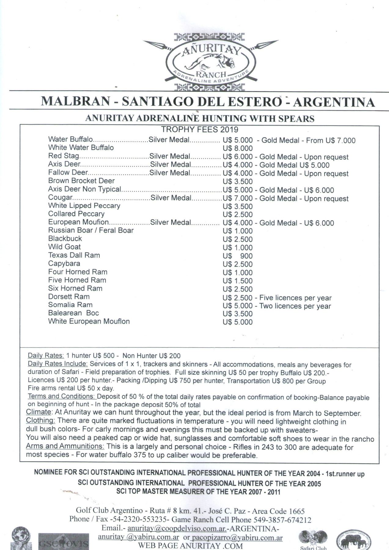 Argentina:  Anuritay Ranch - Francisco "Paco" Pizarro of Anuritay Ranch is donating a 7-day big game hunt for two hunters.  Included in the donation are trophy fees for 1 Boar, 1 Texas Dall Ram, and 1 Wild Goat  per hunter (total of six trophies).  The donation also includes luxury lodge accommodations, laundry service, meals, guide services (1 X 1), free use of guns (if desired), trophy field prep, and caping/salting of trophies. Not included are domestic/international airfares, hunting license ($200 per hunter), $800 ground transportation fee(roundtrip per group of up to 4 people) from  Santiago del Estero airport to lodge round trip , packing and dipping of trophies and veterinary certificate ($750 per hunter), and tips.  You will hunt 20,000 acres of land with 22 different species of big animals available.  Extra days can be added at $500 per day.  Additional trophies may be taken for the stated trophy fee: Red Stag, Fallow Deer, Axis Deer, Water Buffalo, Cougar, Brown Brocket Deer, White Lipped Peccary, Collared Peccary, Capybara, Mouflon, and more.    "Paco" was the 2005 SCI International Professional Hunter of the Year.  Method of take is hunter’s choice.