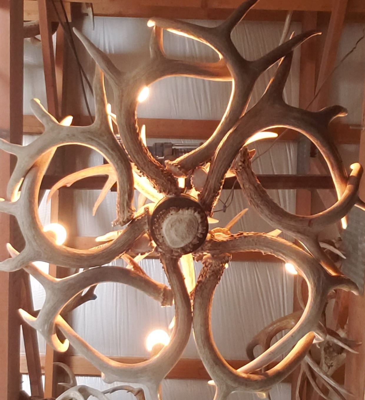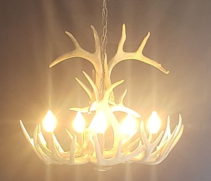 Gorgeous 5 light whitetail antler chandelier made by Fish's Antler Art in Bozeman MT.  Included: bulbs, chain, hardware and free local delivery and installation!  If sold out of area BUYER AGREES TO PAY FOR SHIPPING.