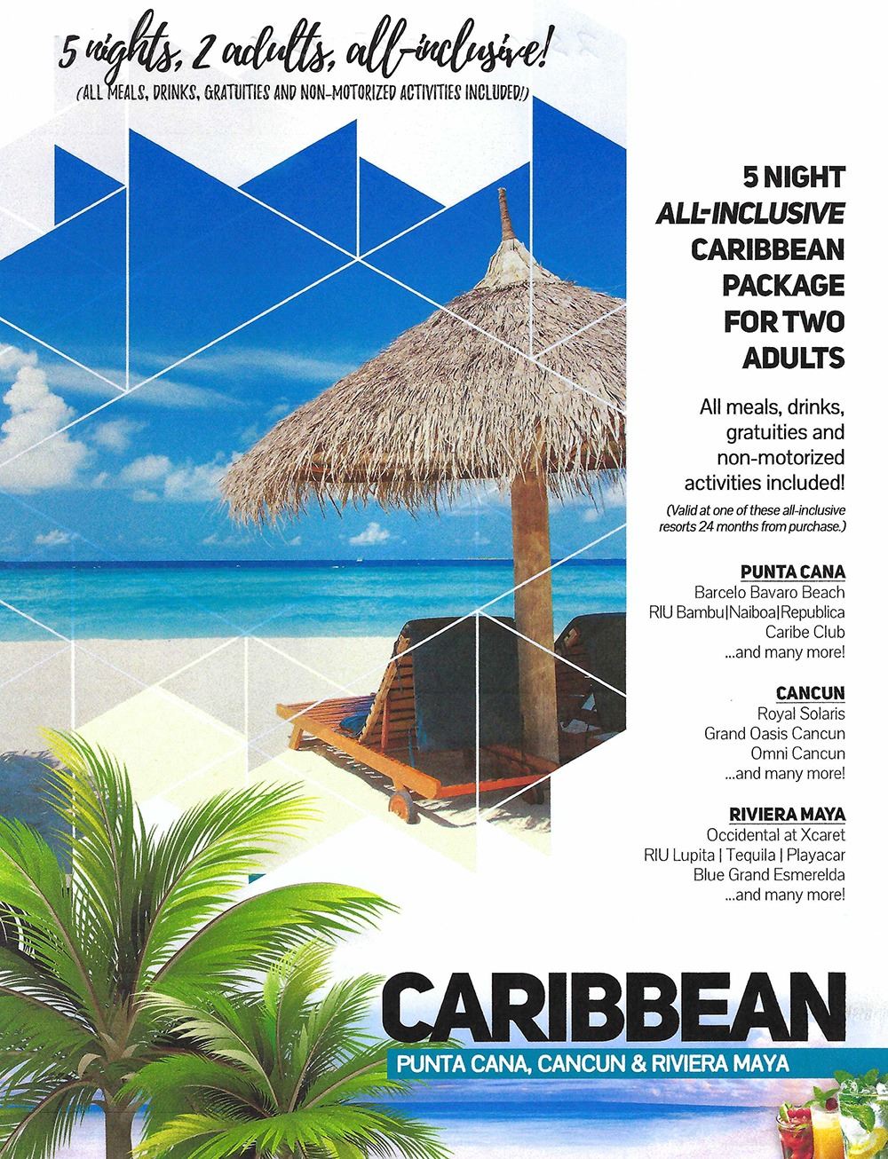 Grab your swimming suits and suntan oil and head for the beach! All-inclusive Caribbean vacation package for two adults. Your choice of Punta Cana, Cancun, and Riviera Maya, over 35 resorts to choose from, your choice. Package includes hotel for 5-nights, all meals, drinks, non-motorized activities and gratuities. Not included are airfare and transfers. Your vacation package is valid at one of these all-inclusive resorts for 24 months from your date of purchase.
