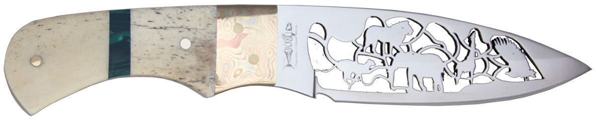 Mackrill Custom Knives has created a special knife for our auction this evening.  Mackrill knives are handcrafted in South Africa and are coming to you direct from this custom knifemaker.  Mackrill is world renowned for their cutlery and is a repeat donor to the Novi Chapter.  Pay special attention to the details of this fine piece.  The handle of this beautiful knife is a special animal style with bone and Malachite stone in a centre strip handle.  It has a three-tone Malachite bolster and a Bohler N690 polished blade.  The blade is unique in that it has cut-outs of various animals in the blade.  This unique knife also comes with a certificate of authenticity.   This beautiful piece will look great in your trophy room or in the field. This item is located on the table next to the stage.  Be sure to check it out.