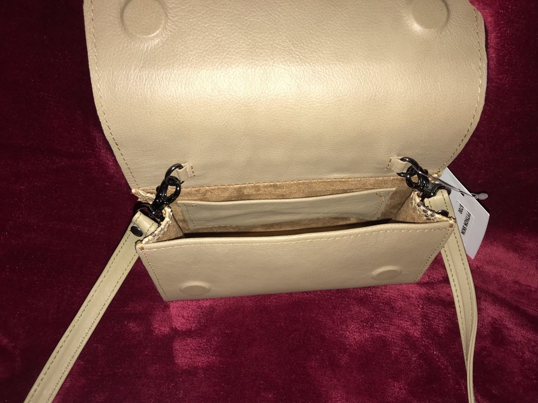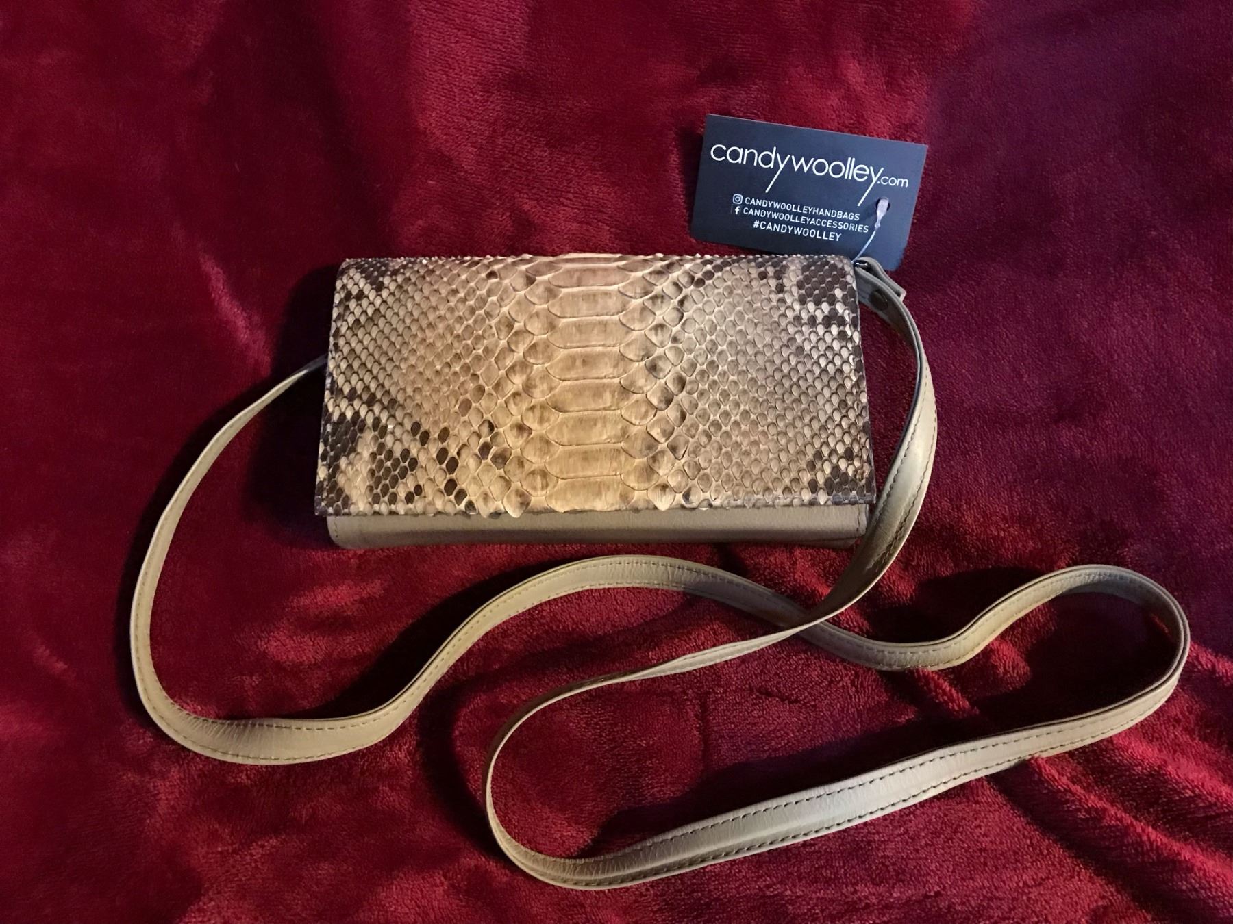 Python Clutch Bag with strap.                                                     Flap: Genuine Indonesian Python skin, Backside: Beige smooth leather, leather strap. Magnet closure. Fully lined with an interier compartment. Gusseted with python skin. Handcrafted in the USA from inported hides. the Python skin and leather were tanned in Italy.                                              Size: 4.5" Tall, 8" wide, 2" deep            Value - $850           Candy Wooley Exotic Handbags                                                          candywooley.com