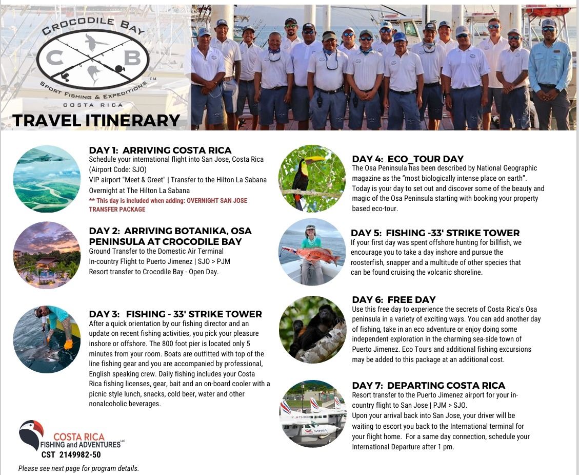 Not Included: International airfare into San Jose, Costa Rica (airport code: SJO). Meals unless stated. Any overweight Seat/Luggage fees for domestic airlines. San Jose Transfer Package, Alcohol: beer is available on your fishing charters, Gratuities and Change Fees