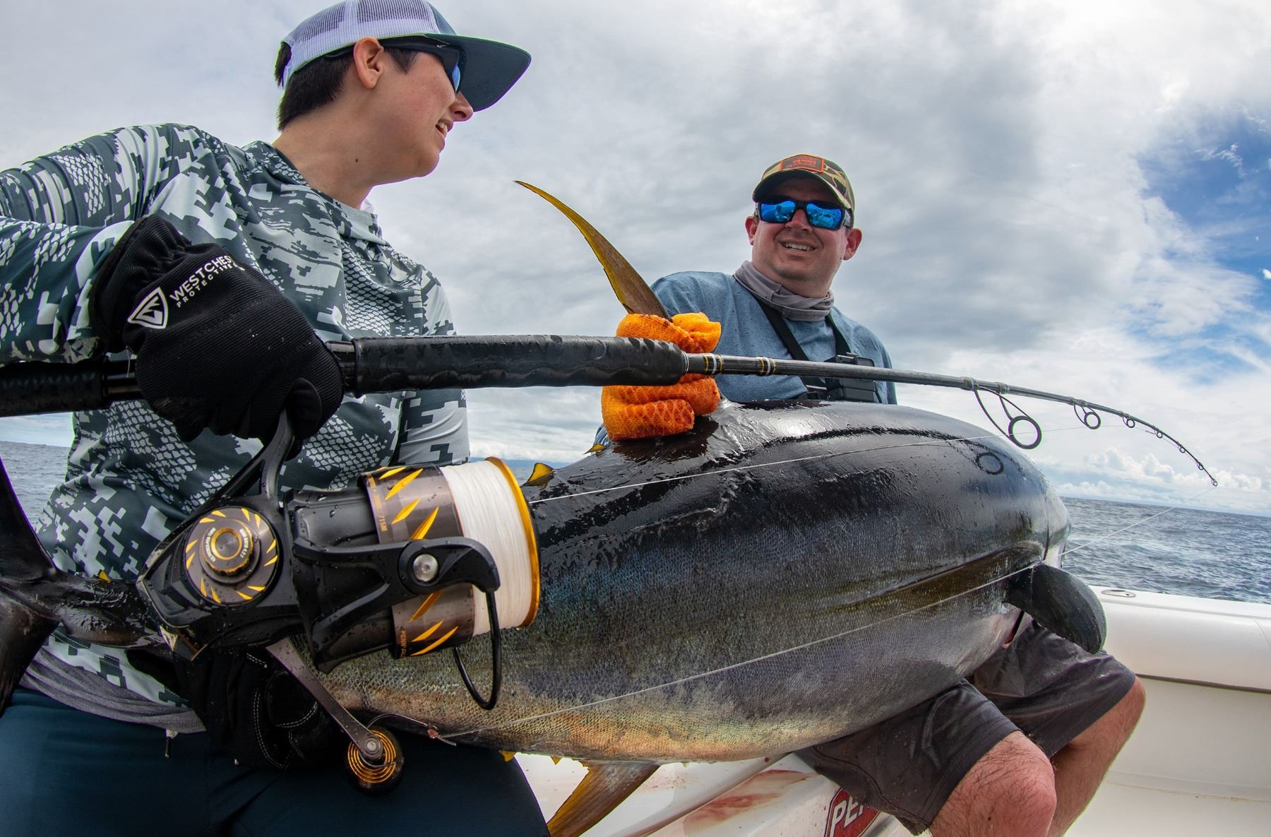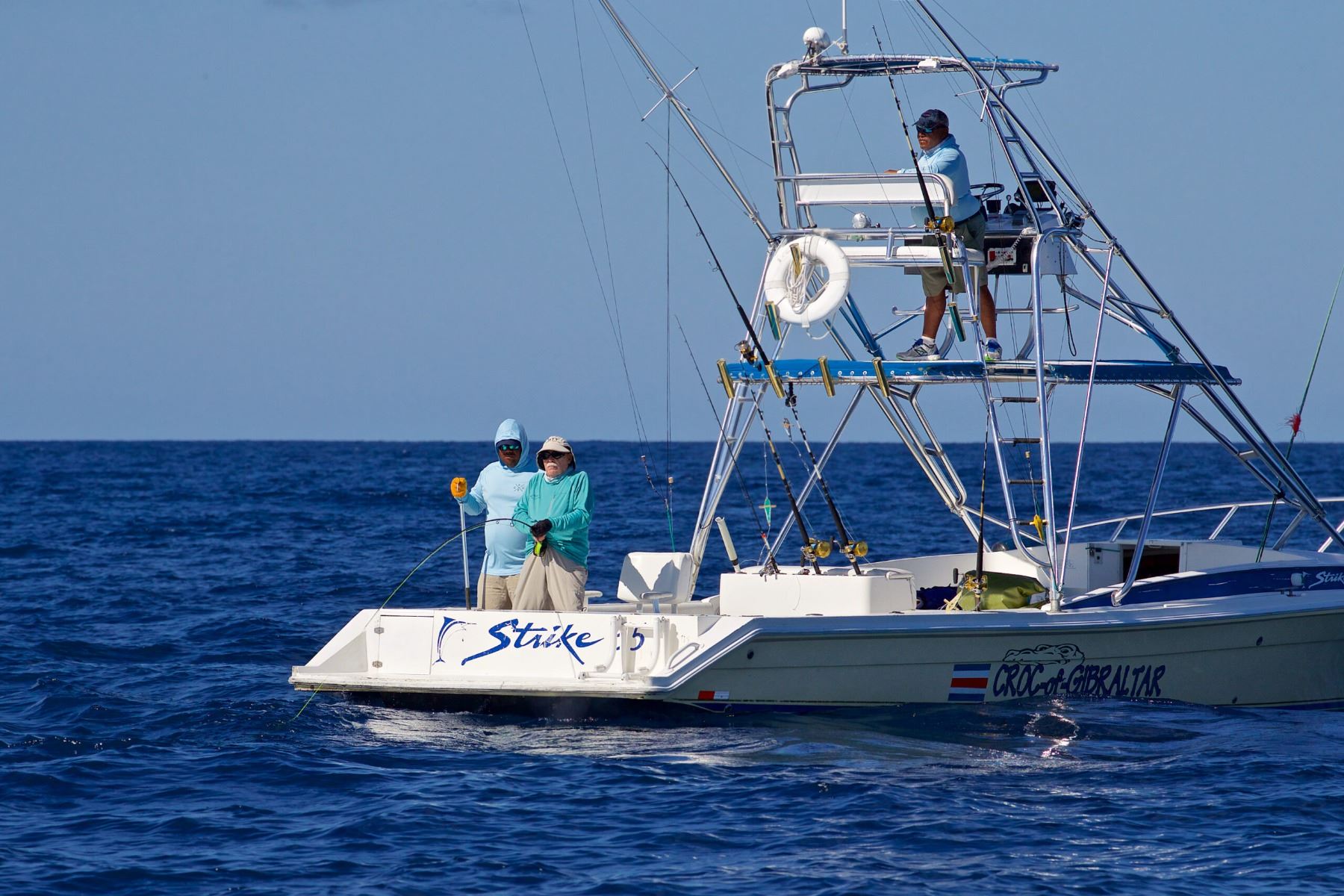 33′ STRIKE TOWER BOATS 33′ Strike Towers have enclosed heads in the cabin for your privacy and convenience. Strike tower boats are equipped with 430 hp inboard Cummins diesel engines. Boats fish inshore or offshore and are equipped with electronics and safety gear. The Strike boats will accommodate up to five anglers. Boats are ready at the pier beginning at 6:30 am and return between 3 and 3:30 pm. Pricing below is based upon a daily charter and includes: Captain, Costa Rica fishing license, gear, bait, fuel and an on-board cooler filled with snacks, picnic-style lunch, beer, water and other non-alcoholic beverages. Our 33’ Strike Towers are available for groups of One (1) to (6) Six anglers. Base Rate: $1,995 per boat per day plus tax.