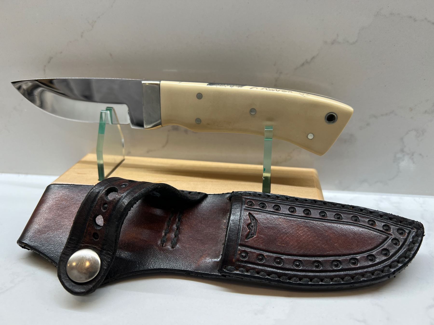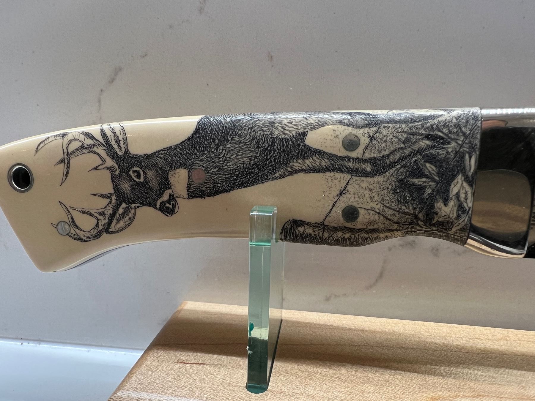 This 8" overall custom handmade knife was constructed by Sire in Bay City, MI features a unique T Raven scrimshaw of a whitetail deer that wraps around the mastodon ivory handles. The 3.5" blade is 440C stainless and has handles with no flaws. Included with the knife is a free standing display that allows 360o viewing.  Donated by Bill and Vicki Swan