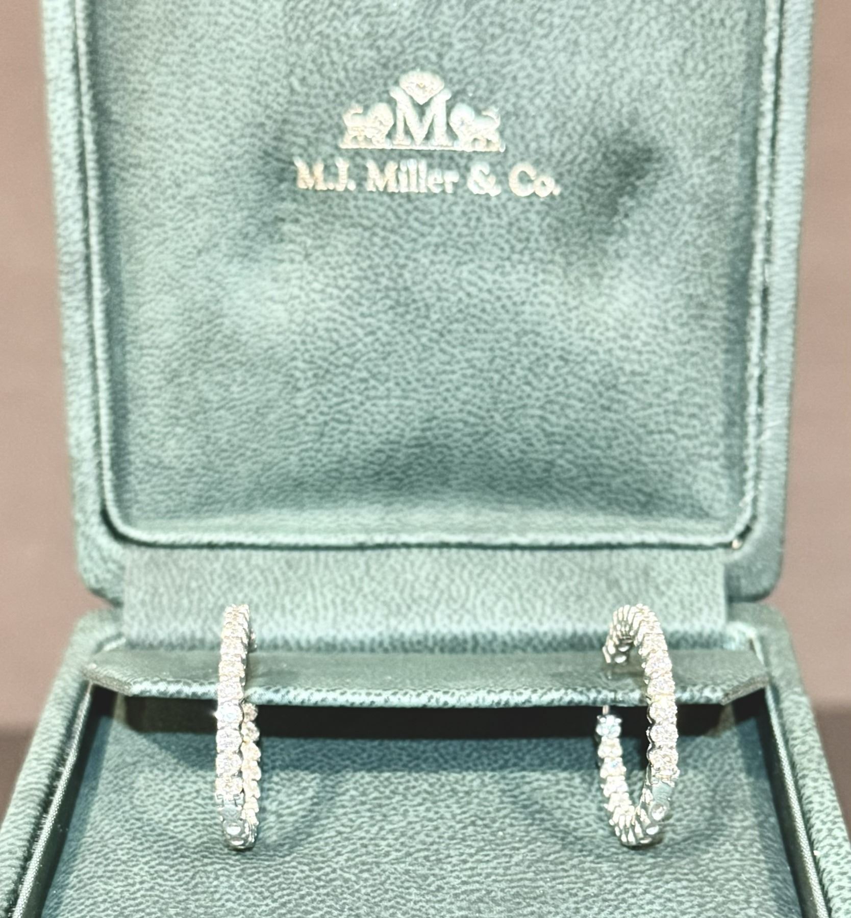 Here is the premier jewelry item of tonight’s auction, a stunning pair of diamond hoop earrings. This pair adds a very special element to classic diamond hoop earrings by placing diamonds on BOTH the outside and the inside of the hoops! Double the diamonds, double the sparkle! Not unlike a premium double-barreled shotgun or rifle! These very unique earrings have 52 round full-cut diamonds with over 2 carats total weight, set in 18K white gold hoops. The diamonds’ clarity is VS, their color is G-H, and the cut and polish are both appraised ‘Excellent’. All of these specs are ones that will impress now and for generations to come. Guys, don’t be the one hanging your head for failing to bid on this exquisite and unique pair of earrings! With over 50 years of experience, M.J. Miller & Co. jewelers in Barrington, IL, is committed to excellence to ensure that each piece is a testament to the art of fine craftsmanship. Includes a replacement value report for insurance documentation.
