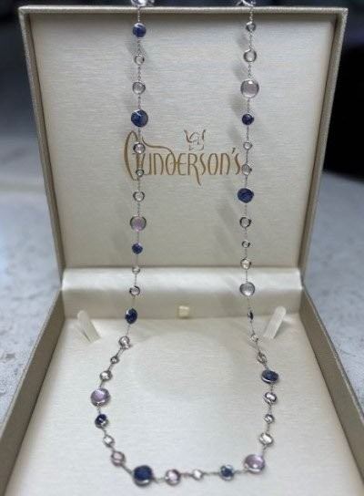 A refined statement of craftsmanship, this 36" sterling silver necklace showcases 47 round, bezel-set gemstones including Clear Quartz, Mother of Pearl, dark Amethyst, Rock Crystal, Sodalite, and Blue Topaz--arranged along a fine chain. The design alternates between soft neutrals and rich jewel tones creating a gentle rhythm of light and color. Timeless yet contemporary, it's versatile piece that elevates everything from casual ensembles to evening attire.