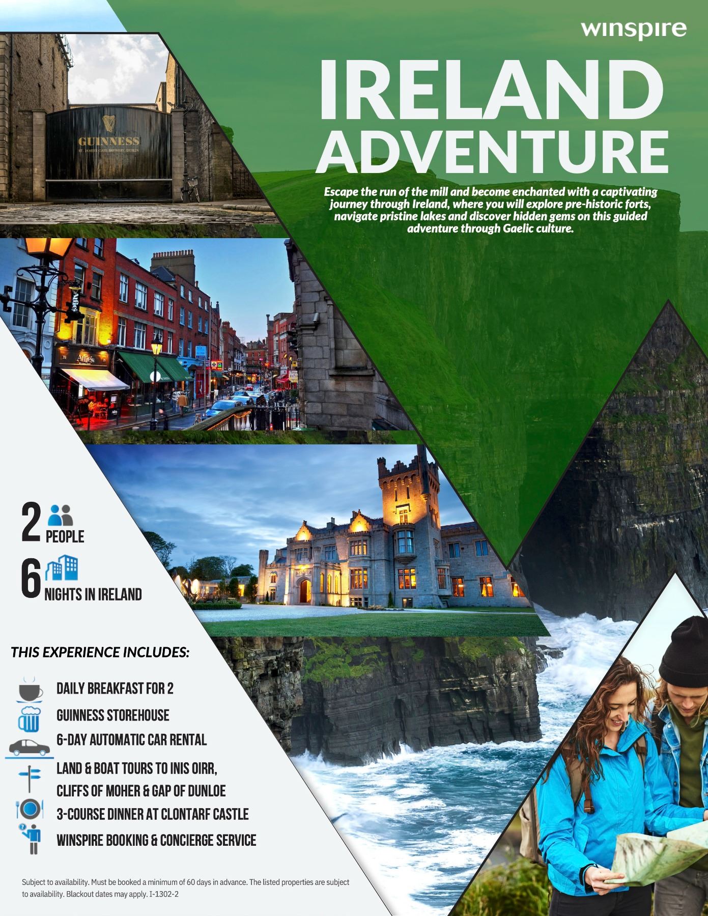Ireland Adventure including a 6-Night stay in Dublin, Ennis, Killarney and Historic Castle Overnight with Automatic Rental Car, Guinness Storehouse Tickets, Gap of Dunloe, Inis Oirr & Cliffs of Moher Excursions for 2. This is a curated adventure where you can focus on just being there and enjoying it.