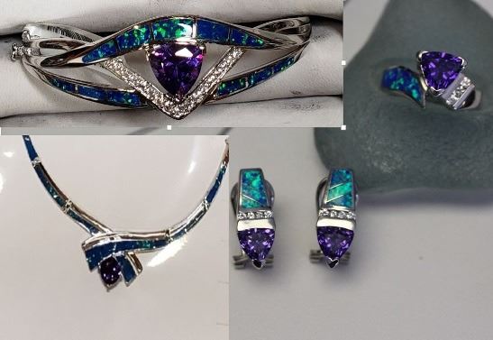 Up for auction is another stunning Crushed Opal Set of jewelry that includes a brand-new modern choker style necklace, a bangle bracelet, a set of earrings and a ring (available in any size). This unique collection is sure to be a great addition to your jewelry collection as these pieces can be worn every day or just as easily for any formal occasion. Put up your hand to win this jewelry and try to count the number of compliments about to come your way.