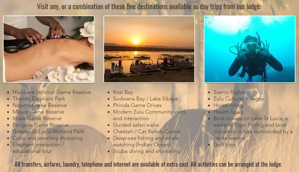 - Day trips to Hluhluwe Umfolozi Game Reserve,