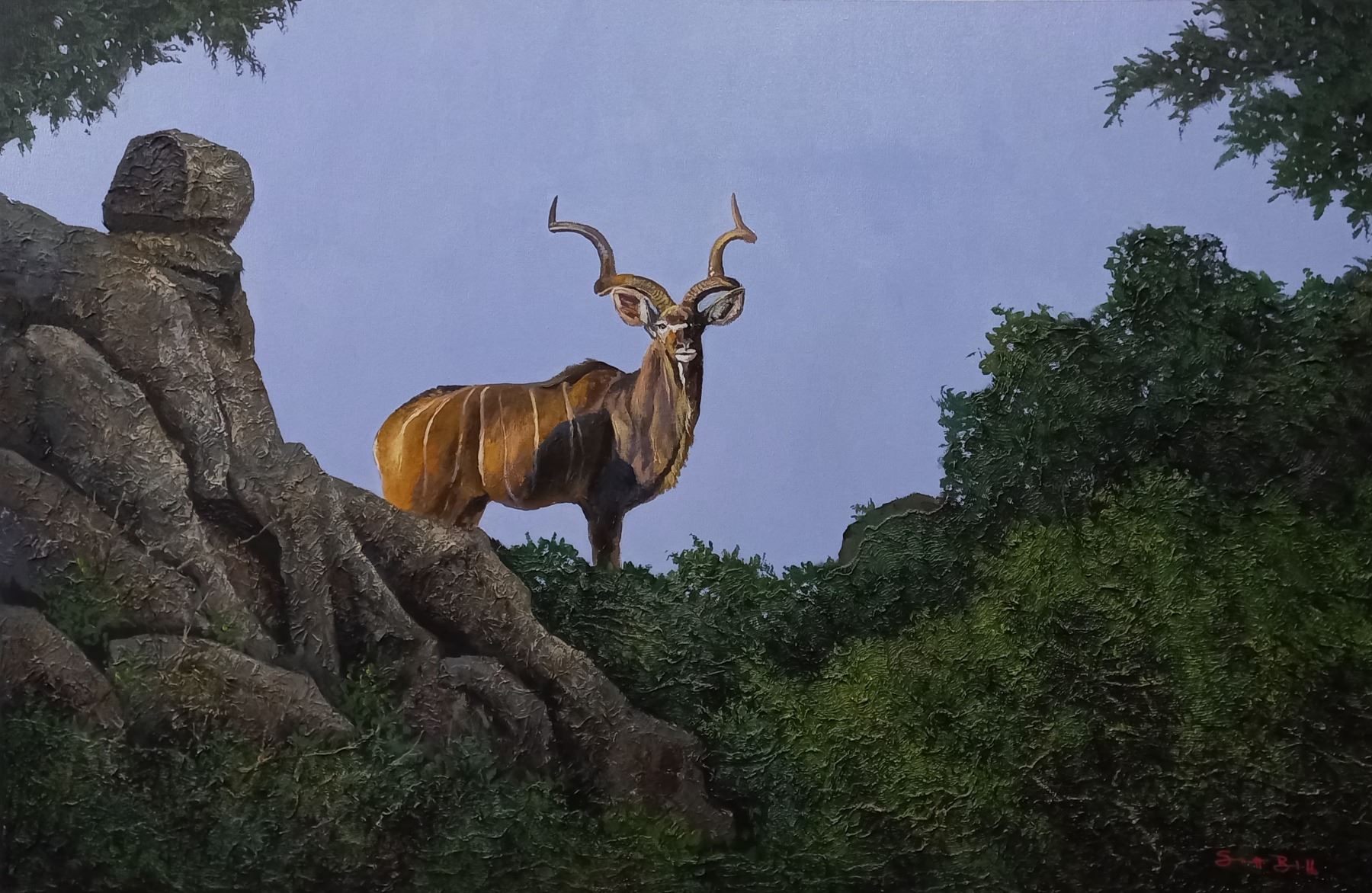 Mixed media on canvas. “Golden Hour” framed original Kudu painting