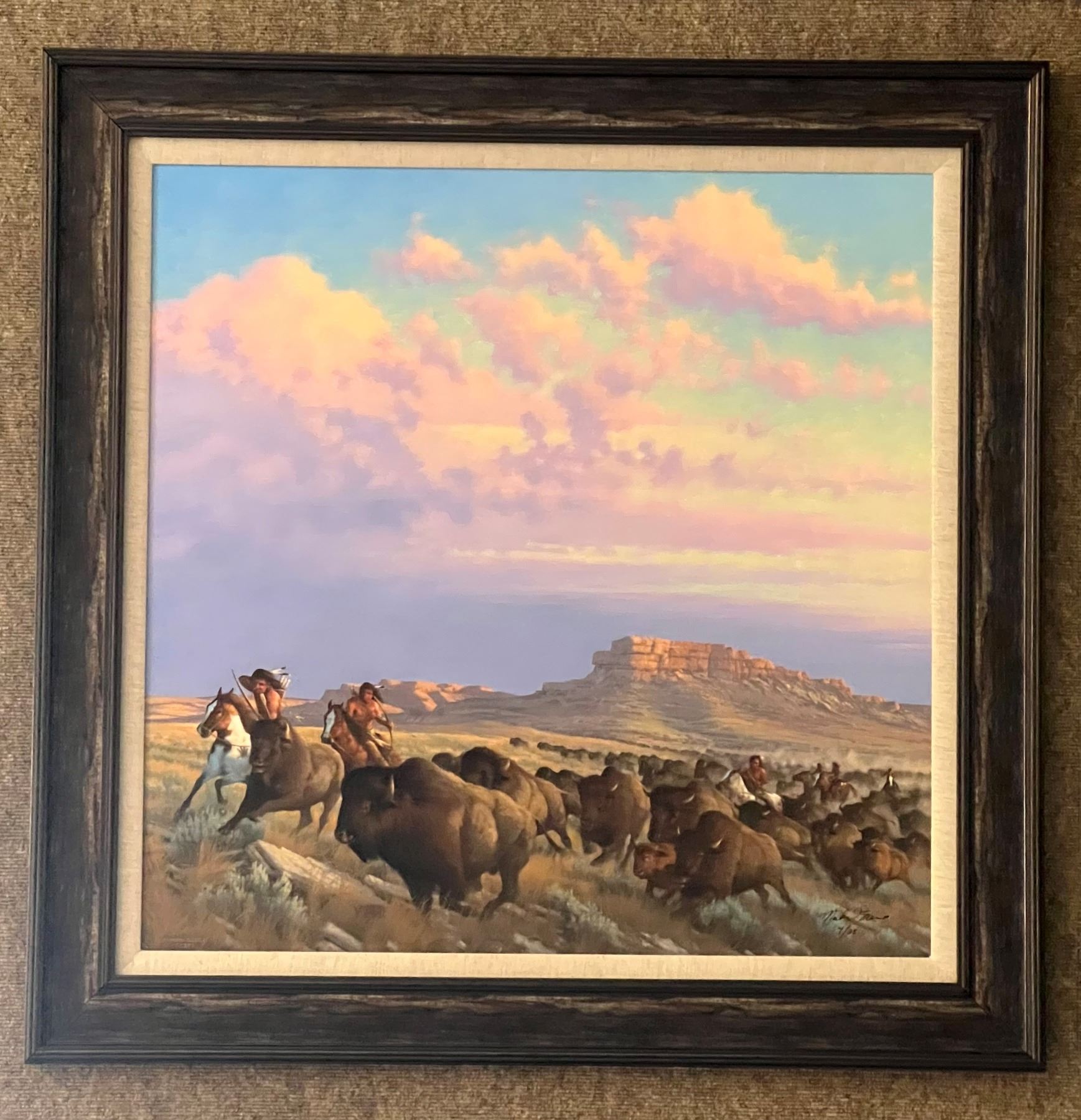 Buffalo Skies by Michael Sieve 38” x 38” outside the frame, limited edition giclee canvas of a band of Sioux Indians hunting bison on horseback. Minnesota SCI would like to thank Chris Knutson for this 100% donation!