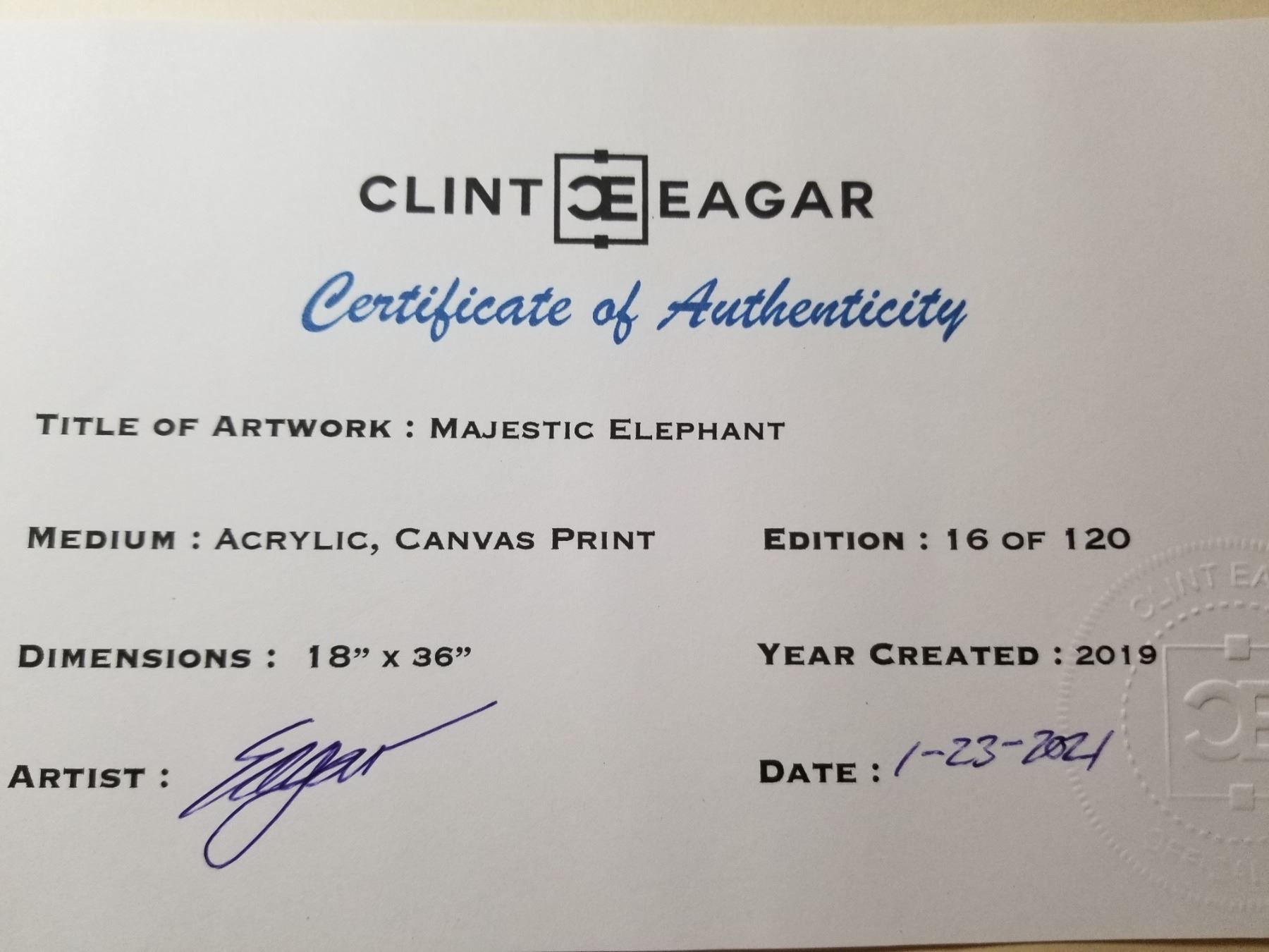 Safari Club International (SCI) named Clint Eagar as Artist of the Year for 2021. His original painting, Big Bull Elephant, was sold at the National convention while 120 giclees of the artwork were made available to SCI chapters for their fundraising efforts.
