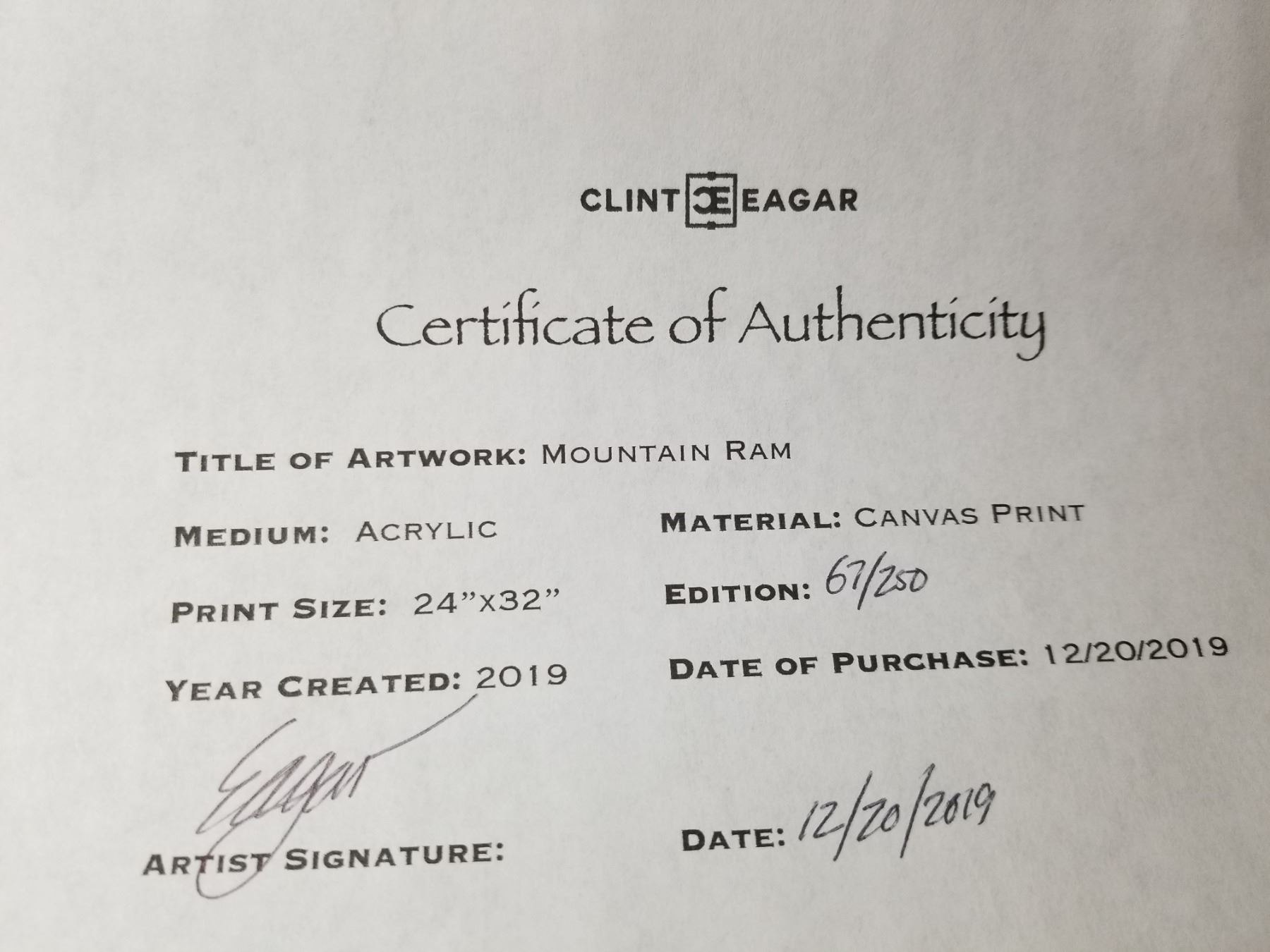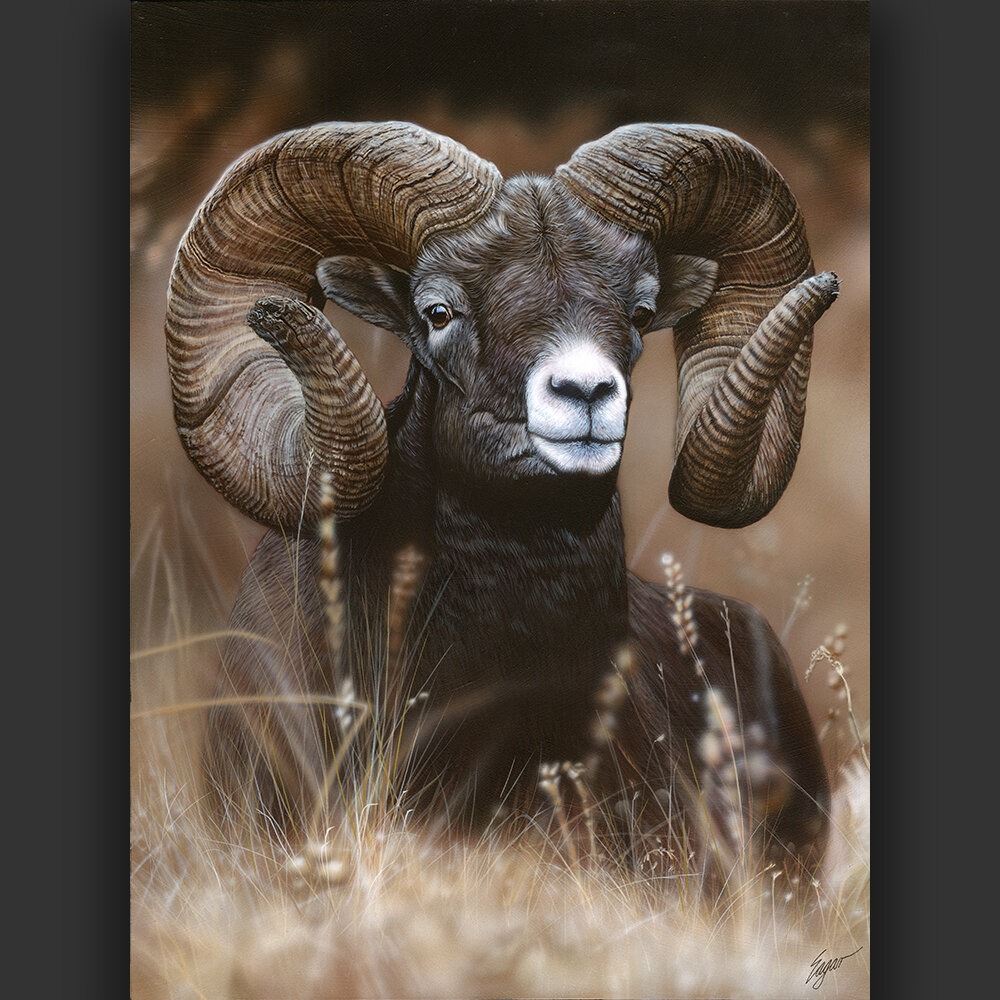 The Mountain Ram is an image of a monarch’s final days before passing away of natural causes in its natural surroundings - Largest such Ram on record in North America. The depth of perspective is incredibly executed by Clint's painting skill and techniques. The framed Ram giclee measures 30 by 39 inches and the framed Bull Elephant is 30 by 48 inches.