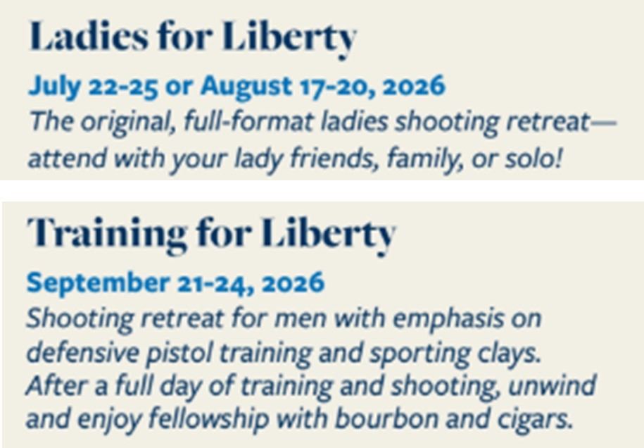 Each camp offers you the opportunity learn safety, marksmanship, and firearms function – with all guns, equipment, and ammo provided! By the end of the retreat, you will be breaking clay target “pairs,” safely shooting while moving with cover and concealment, engaging steel targets with speed, and testing out various firearms with practical applications. Ladies for Liberty is offered for ladies of all levels of experience – first timers to seasoned shooter. Training for Liberty is offered for men of all levels of experience.