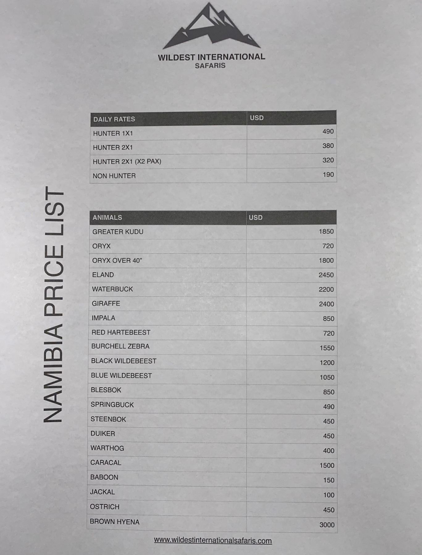 This deposit will be credit towards: Government tags per trophy, Extra Trophies, Gun Rental, Ammunition, Transfers.