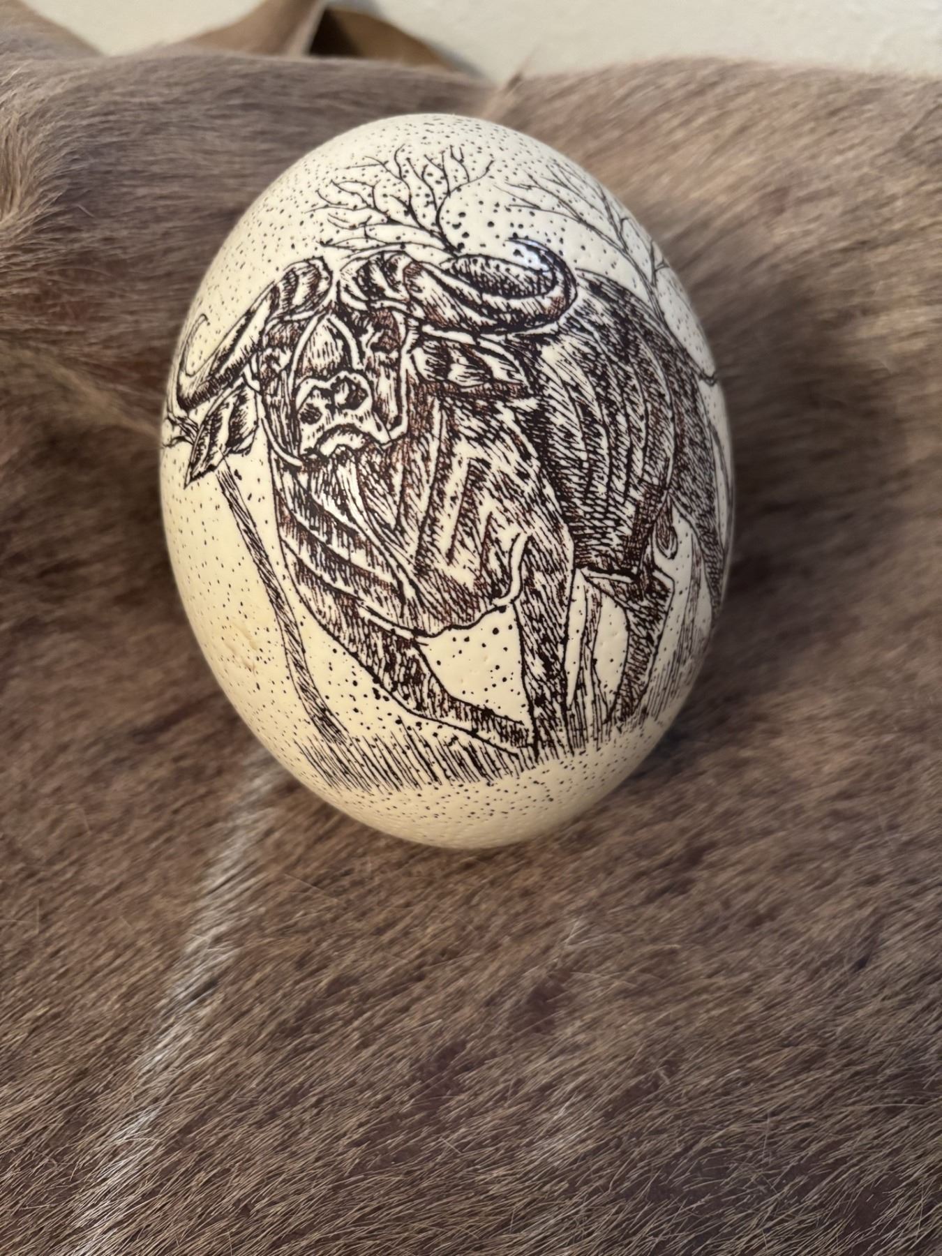 Hand Crafted Scrimshaw Cape Buffalo Ostrich Egg from Zimbabwe
