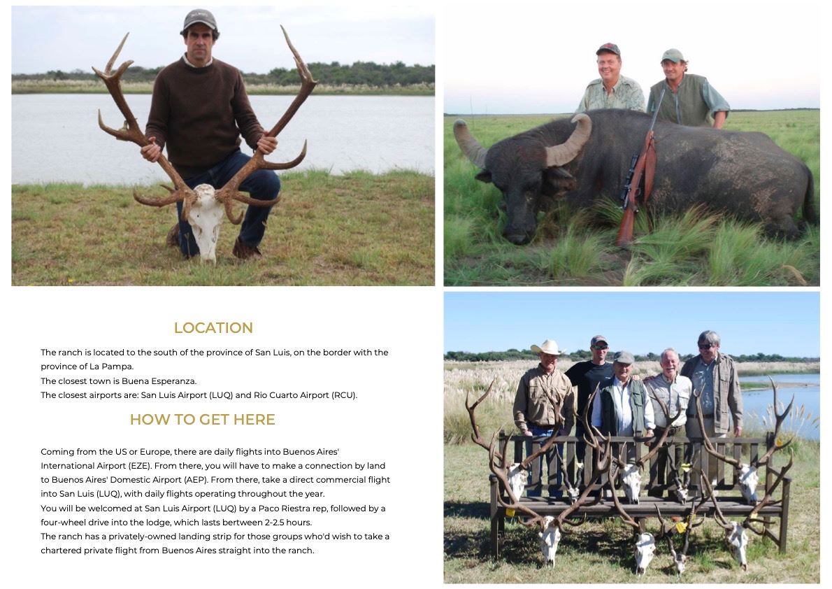 Mr. Asis Riestra, owner of Paco Riestra Hunting, is offering a 5 Day/4 Night 100% free range Big Game Hunt for 1 hunter which includes the trophy fee for 1 Water Buffalo. There is no limit on trophy size for this hunt and you will have 5 days of hunting to find the best available Water Buffalo trophy!  Paco Riestra’ s 100% free range ranch (located in the San Luis Province, Central Argentina) is 165,000 acres of exclusive private property, which boasts over 600+ water buffalo and 5000+ red stags both with no limit score; 100% free range (no high fence). Additional hunters are welcome at a daily rate of $400 per hunter per day and observers are welcome at $300 per observer per day.