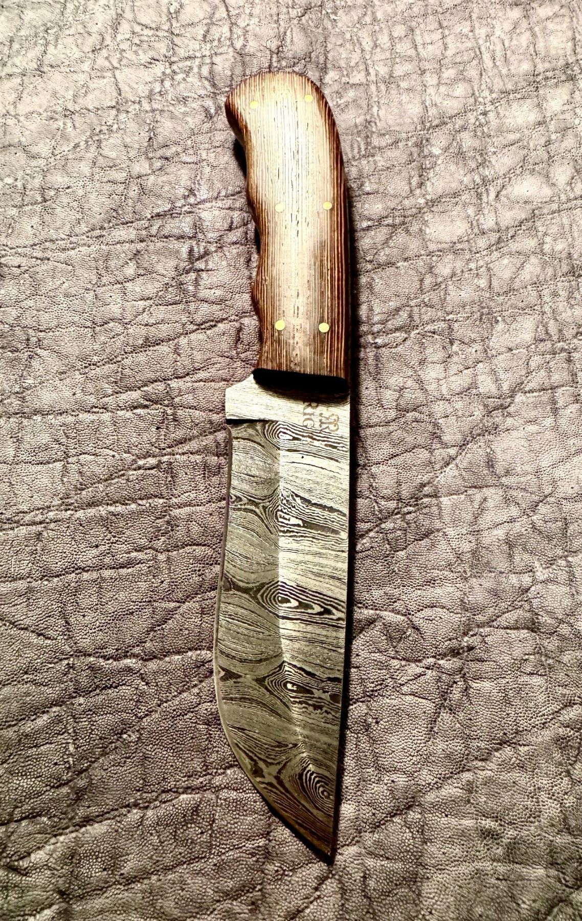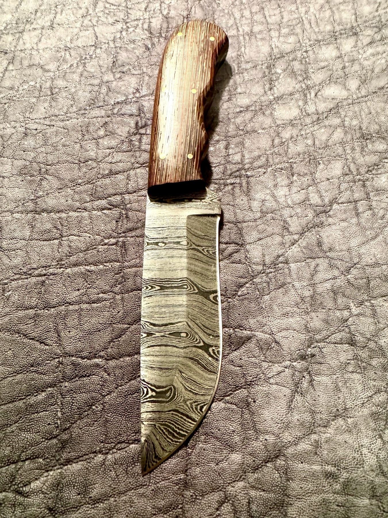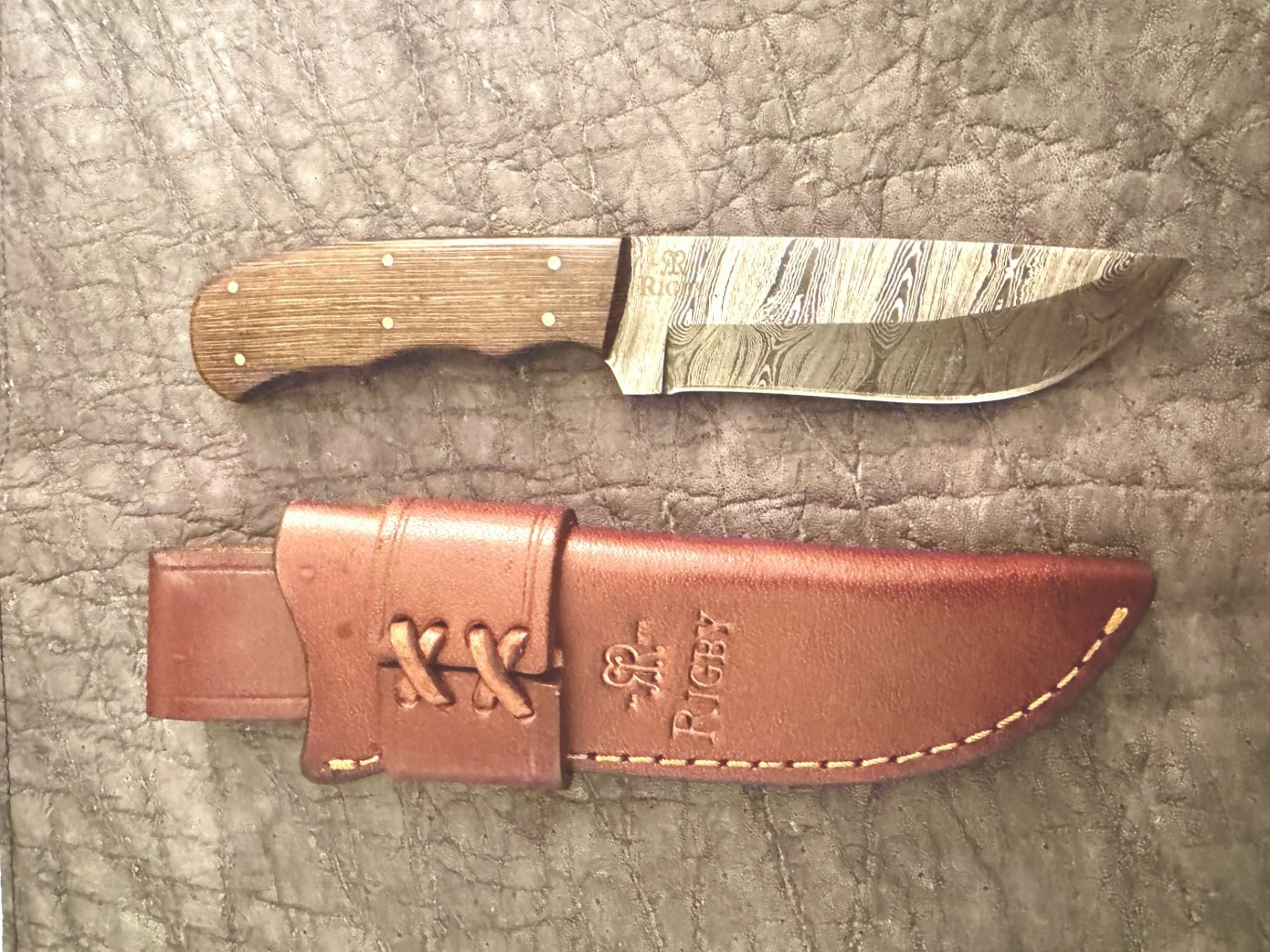 Rigby hunting knife made from ebony wood with a fixed blade crafted from Damascus steel.