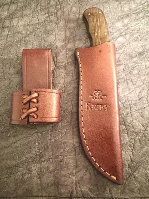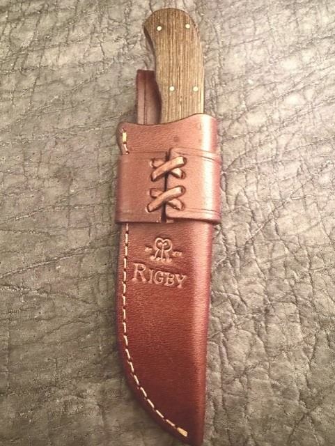 The wide, slightly rounded blade and thumb rest make this a perfect knife for hunting in the field. This knife is engraved with the famous Rigby 'double R' logo and comes complete with a handmade leather sheath also embossed with the logo. Blade dimensions are 9.5 cm long by 3 cm wide. A Rigby Selvyt Cleaning Cloth is included with this item.