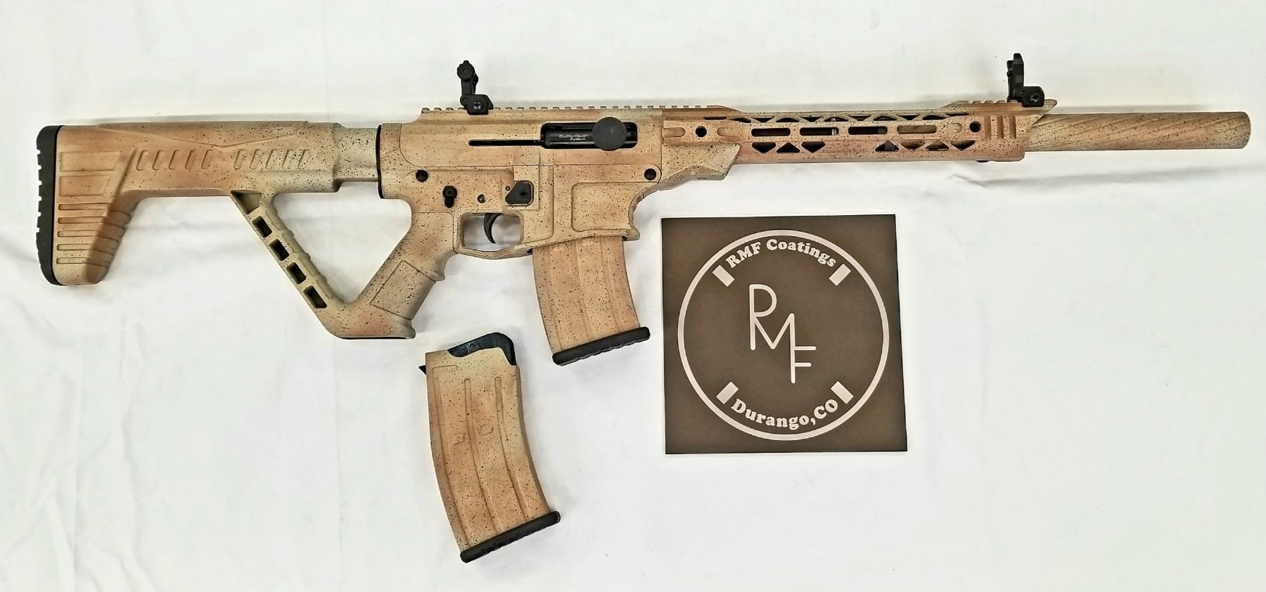 This shotgun has then been customized with a unique sandy finish buy RMF Coatings, truly a one of a kind gun.