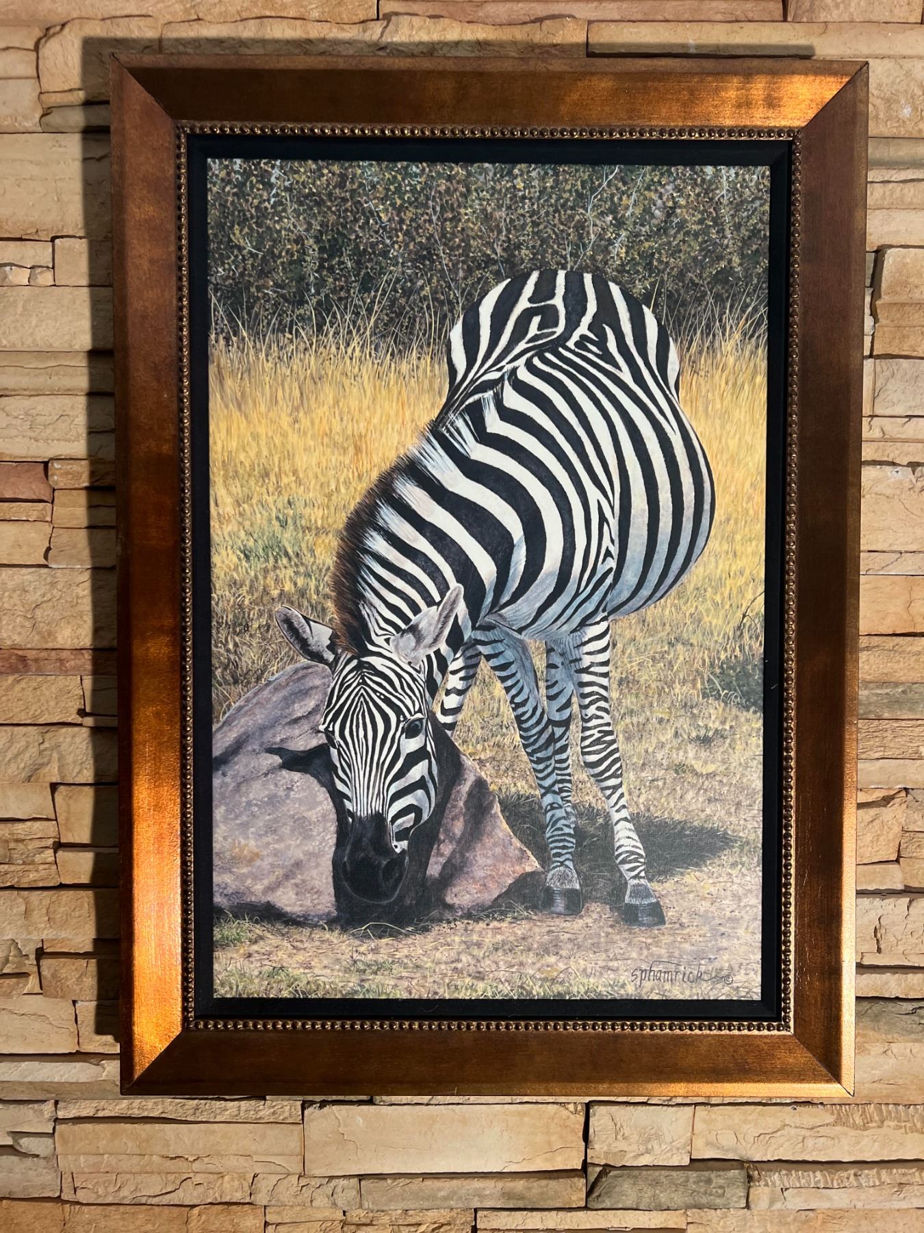 Zebra giclee, framed, 20" x 30" image by artist Steve P Hamrick. Shipping not included, in-room bidding only, no online bidding. Steve Hamrick is a Minnesota outdoors man, biologist, and lover of fine art. He has won many awards including the most recent 2020-2021 Pheasants Forever Artist of the Year, 2021 Minnesota Trout stamp, 2021 Minnesota Pheasant stamp and 2021 Minnesota Turkey Stamp.