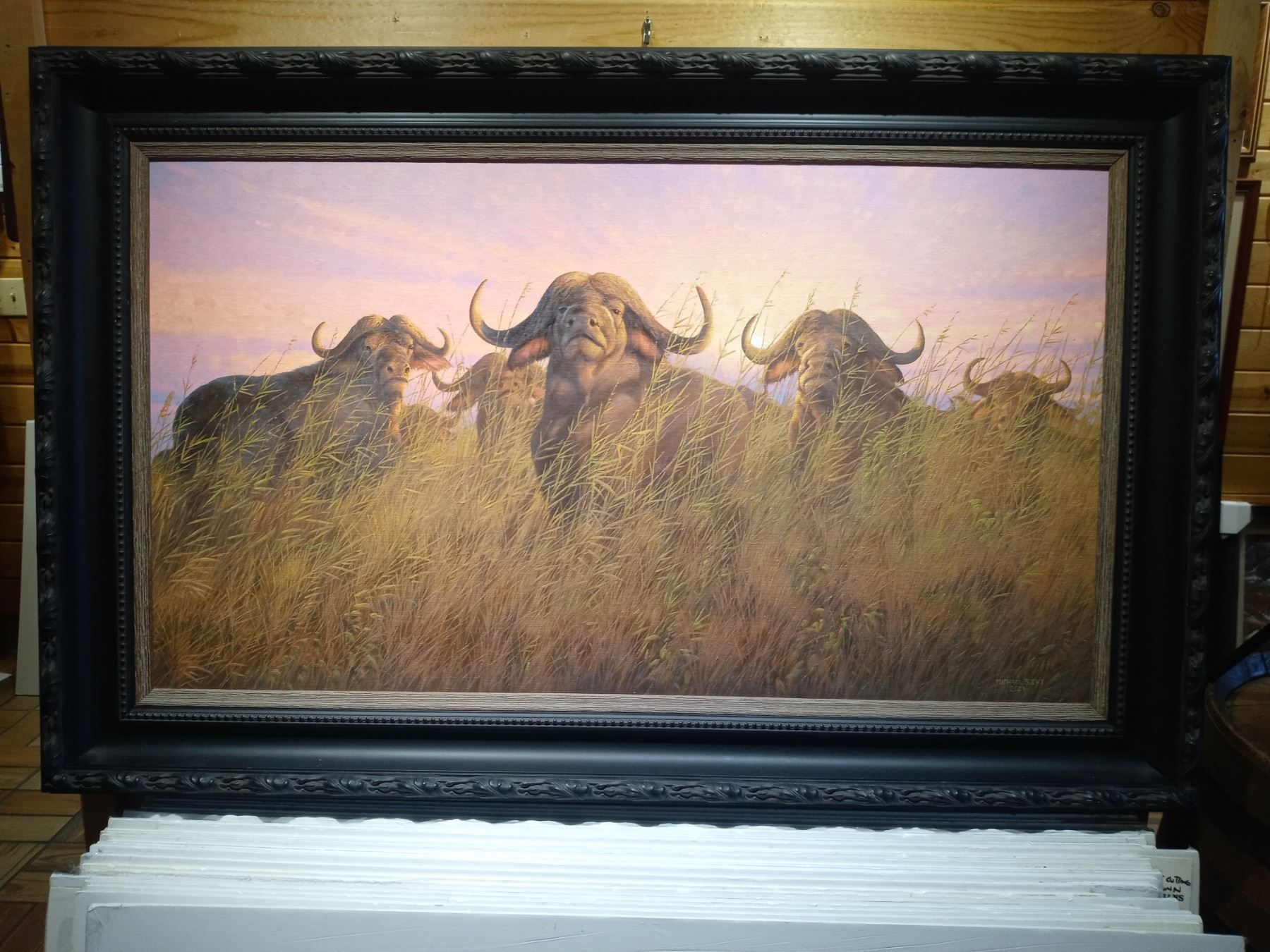 Original Framed Oil Painting titled “Dawn Patrol” by Michael Sieve. This is a 28”’x 40” framed original oil painting of a group of Cape Buffalo at dawn.