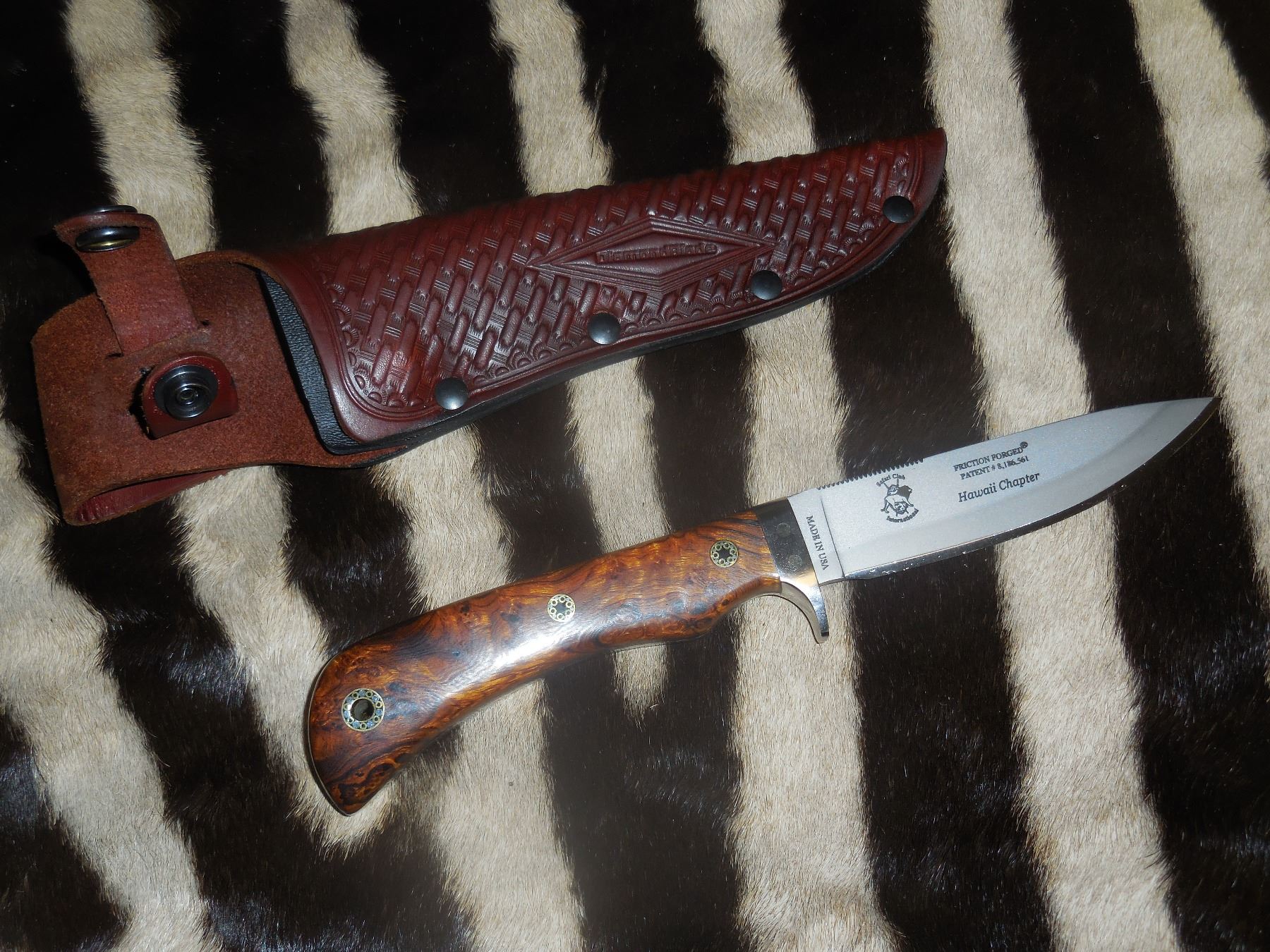 "Surge " by DiamondBlade Knives, engraved with chapter name and SCI logo. Blade length: 4.00"; overall length: 9.250"; weight: 4.50 oz; handle: Desert Ironwood; drop point blade style; 440C stainless steel bolster; rust inhibitor coating.