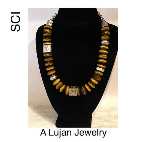 An incredible one of a kind high grade Tiger Eye Necklace with handmade sterling silver cubes and an adjustable 16in to 22in chain. Tiger Eye jewels have a history since ancient Chinese times being worn to transfer power & courage from the tiger, clear negative energy and build confidence, self worth, and enhance psychic abilities. No tigers were harmed in the creation of this custom made work of art! Angela Lujan, A Lujan Jewelry 720-456-1861 www.LujanJewelry.com