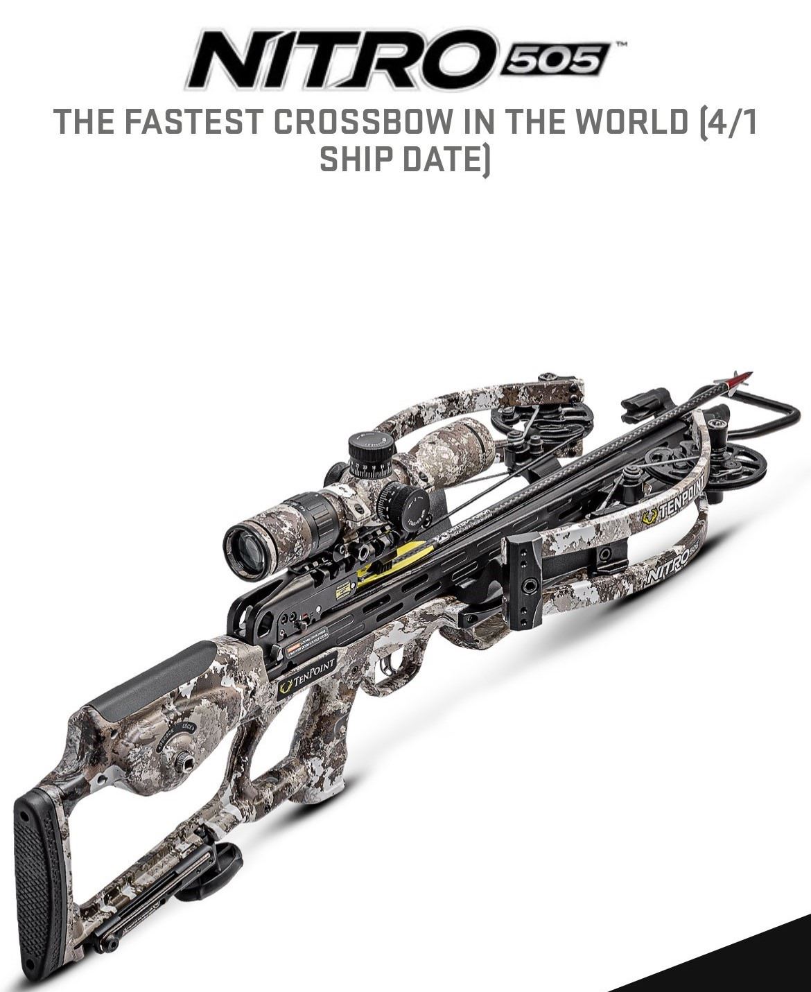 Meet the Nitro 505. With speed of 505 feet-per-second and 227-foot pounds of blistering power, the Nitro 505 is the fastest crossbow on the market and the most powerful crossbow ever built by TenPoint.