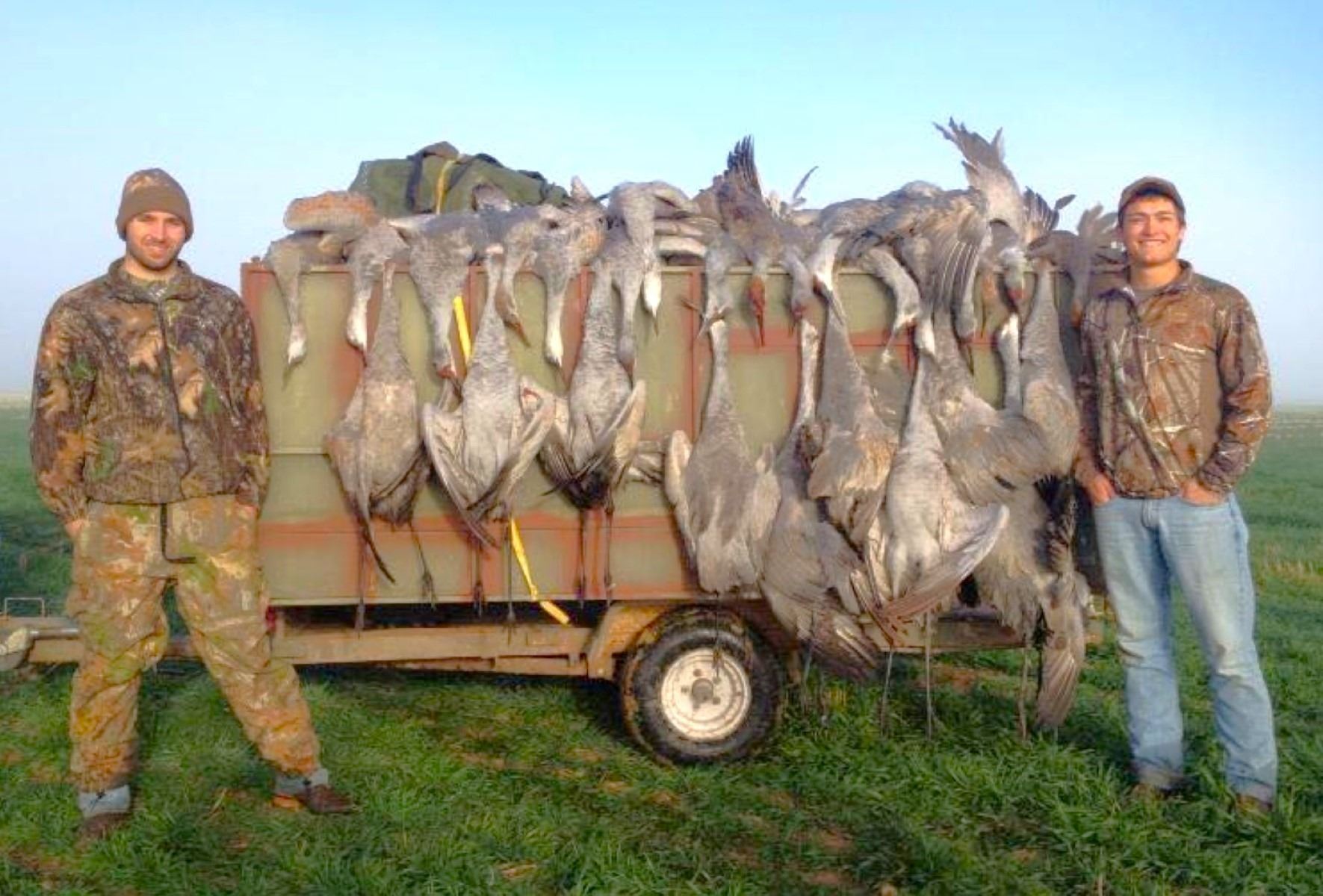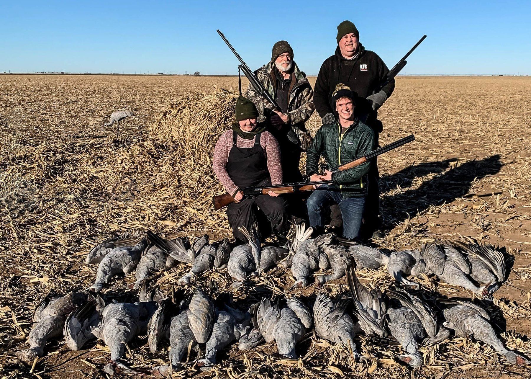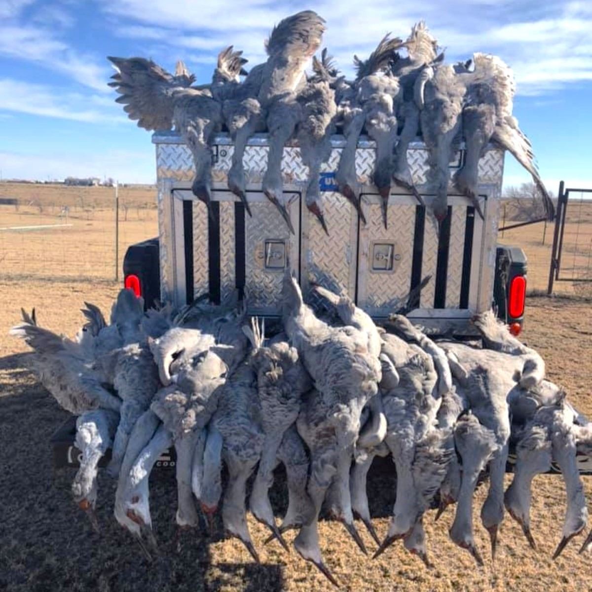 migratory species. Near or Far we can drive up to an hour away to find the biggest group of cranes possible, but the spread will be set and ready for you when you arrive! Typically we hunt out of layout blinds or aframe style brushed blinds along irrigation turrets or ditches. (“There ain’t much to hide behind in West Texas”) Limits are 3 cranes daily and 5 lesser Canadians per hunter, with that said if you’re a bird hunter you know how migratory birds can be and sandhill cranes are a notoriously difficult bird to decoy. With our experienced crew we will use our knowledge to the best of our ability for you to enjoy the beautiful sight and sound of these cranes as they pile into the region for their migration farther south. We typically finish hunting around 11am each day. This gives you ample time to get back to the hotel, grab lunch in town