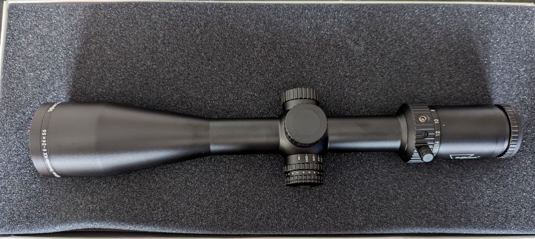 Donation: Trijicon Tenmile HX TMHX2450 6-24x50mm riflescope, 30 mm tube, second focal plane (SFP) eith red LED dot, MOA ranging, satin black, low capped adjusters