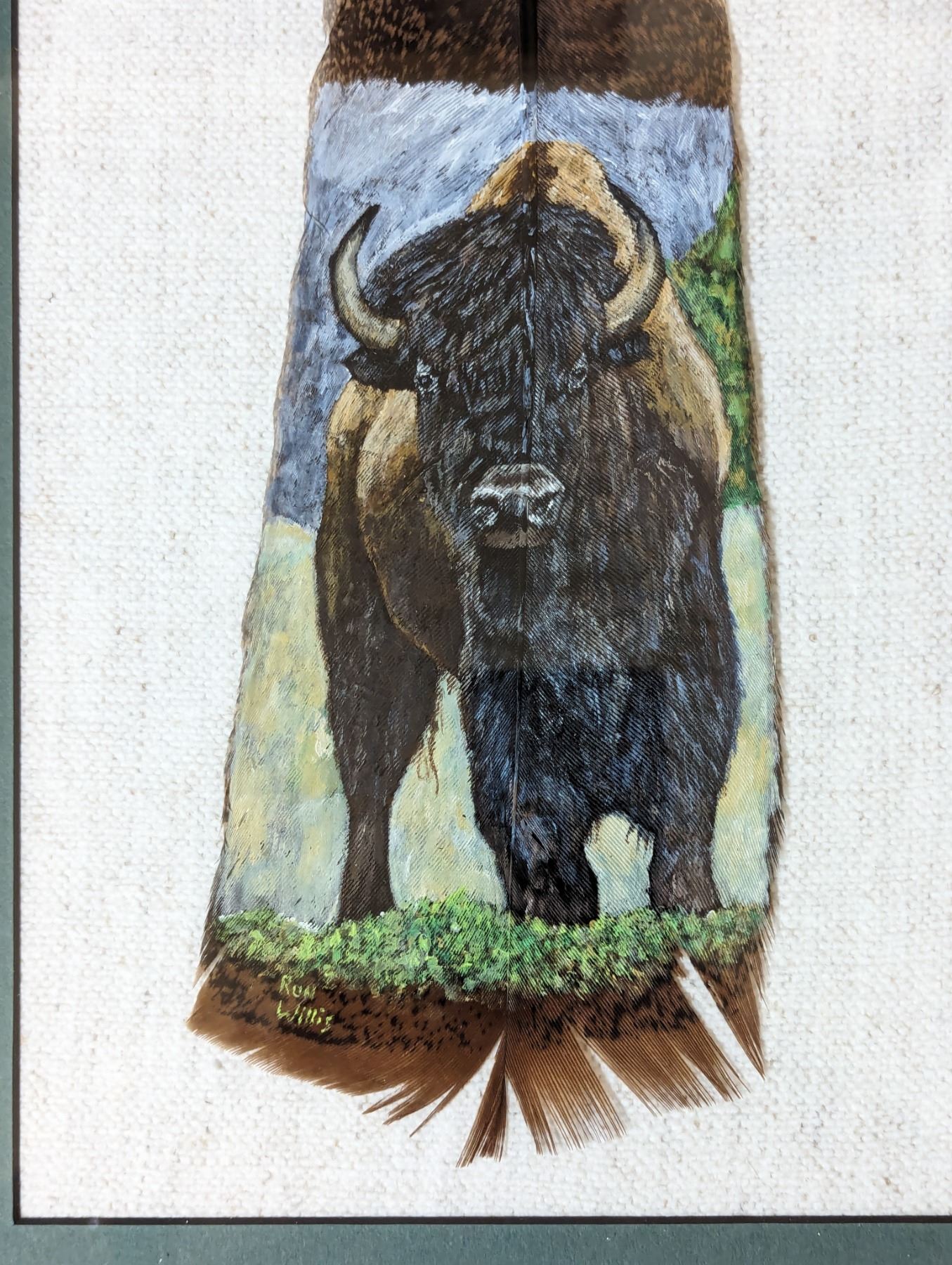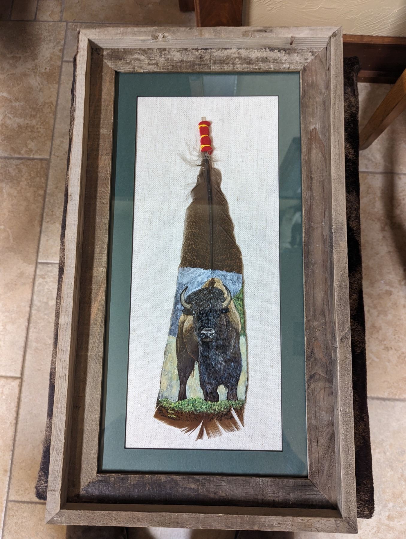 Own this original and unique piece of art! Artist Ron Willis of Linwood, North Carolina donates a framed and matted wild turkey feather. The piece features an American Buffalo painted on a turkey tail feather. This one-of-a-kind artwork is ready to be hung in your home or office. Buy it now, it’s your only chance, as you’ll never see another! E-mail: Willisart@rocketmail.com.
