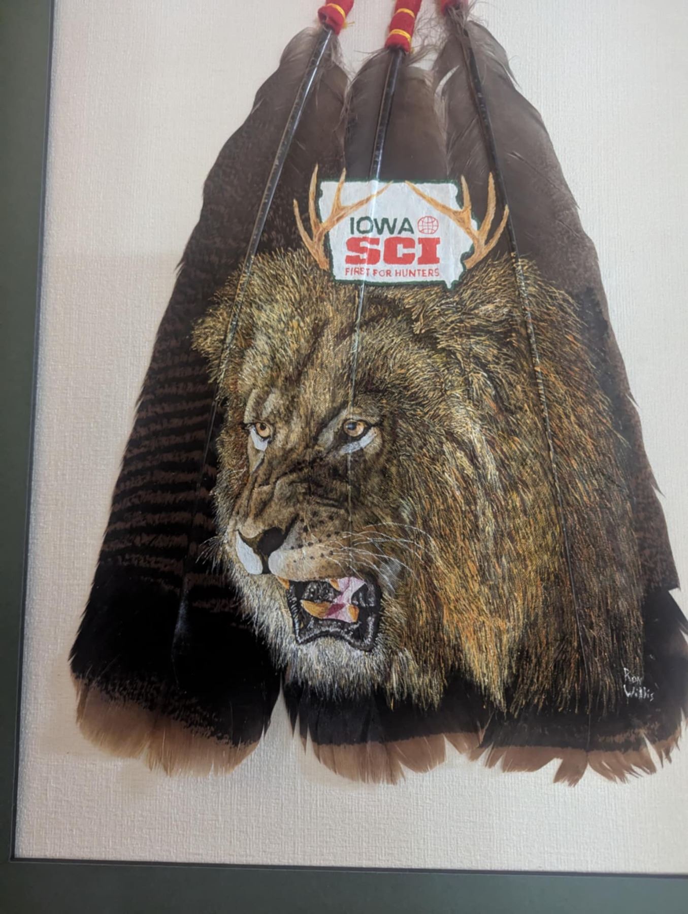 Own this original and unique piece of art! Artist Ron Willis of Linwood, North Carolina continues to donate unique art in support of our cause. This one features the dominate image of an African Lion below the Iowa SCI logo painted on three wild turkey feathers. This one-of-a-kind artwork is framed and ready to be hung in your home or office. Buy it now, it’s your only chance, as you’ll never see another! E-mail: Willisart@rocketmail.com.