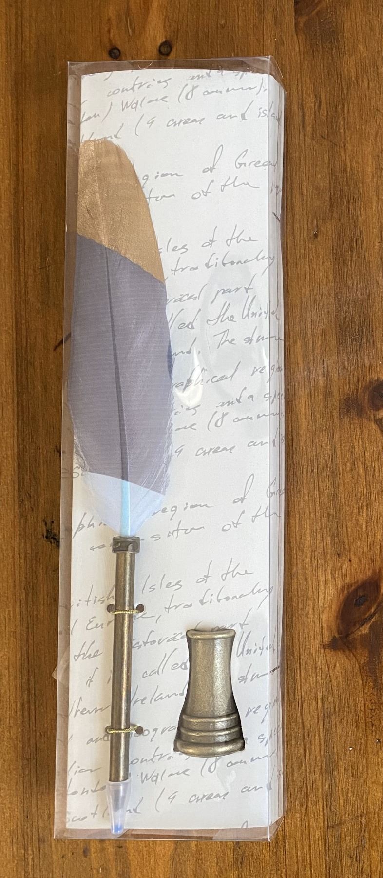 Vintage desk lamp, feather print, feather pen set, crystal globe desk accessory and portable charger