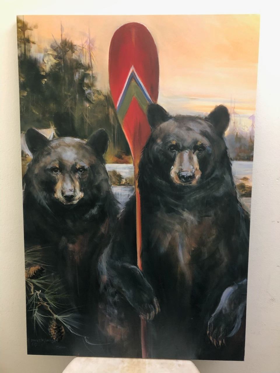 Limited edition giclee print. Ideal for a lodge, restaurant, or cabin. Mason Maloof Designs' American Rustic features a whimsical bear-sonification of the classic American Gothic. Mason's paintings of outdoors adventures are strongly influenced by the work of Oliver Kemp, an illustrator for The Saturday Evening Post, and Philip R. Goodwin, who frequently illustrated Outdoor Life magazine during the 1920s and 1930s as well as advertisements for Winchester firearms and Horton fishing rods. Marilynn Mason's nostalgic illustrations are often described as magical western realism. This fun, conversational piece is ideal for a lodge, restaurant, bar, or cabin.